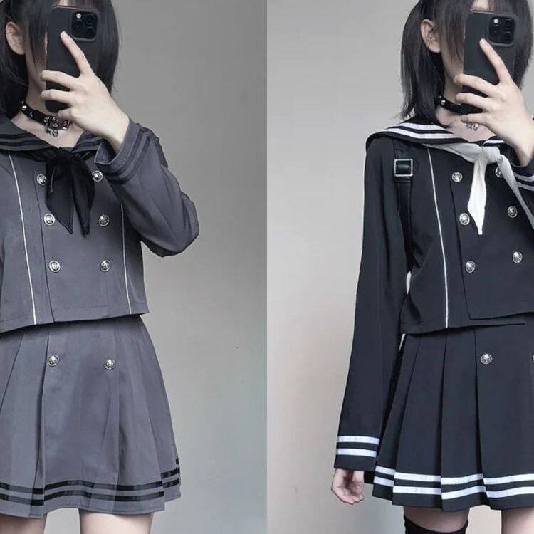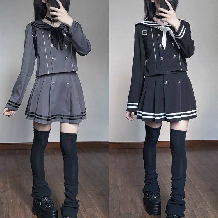 日系甜美学院风海军领水手制服双排扣上衣+小众百褶半身裙两件套