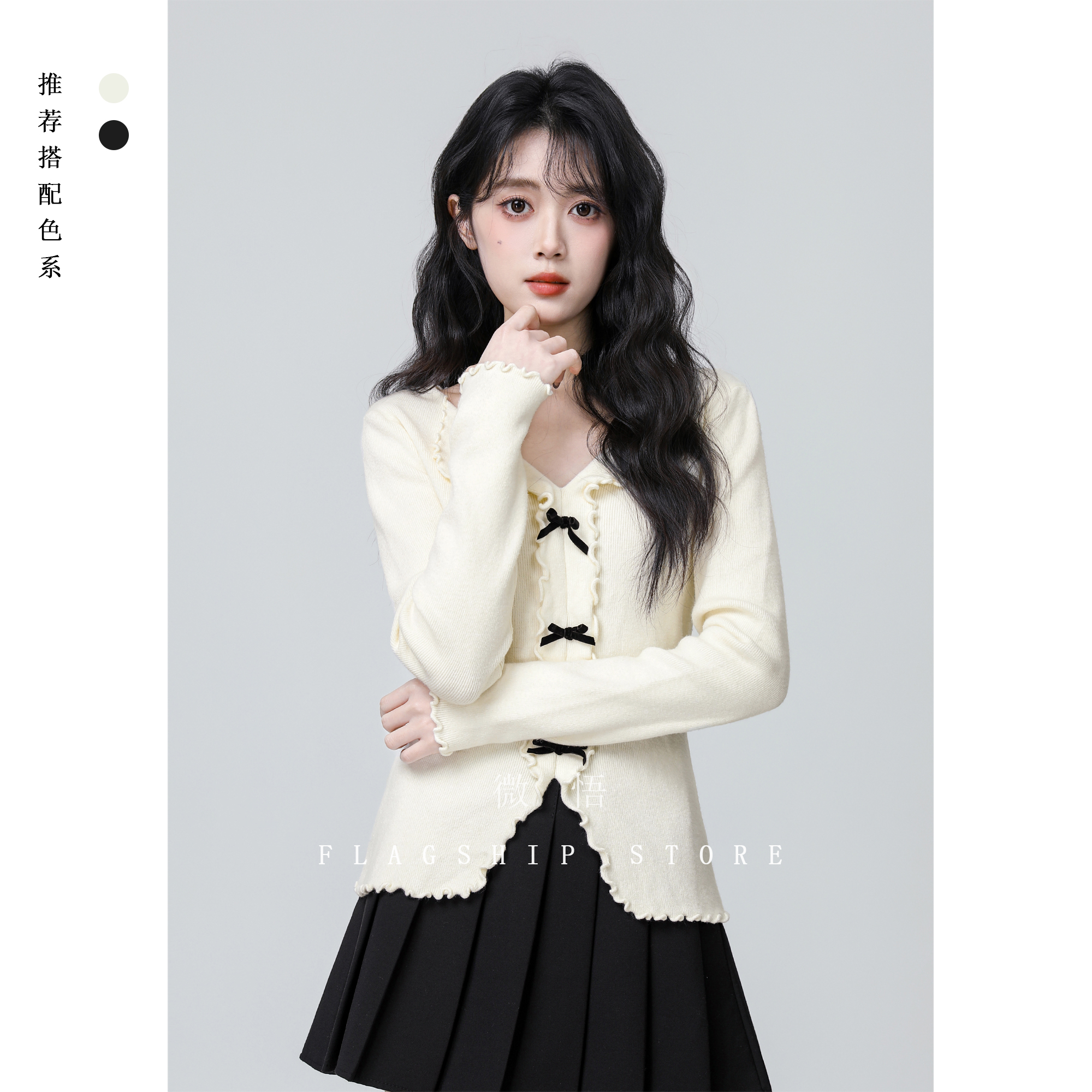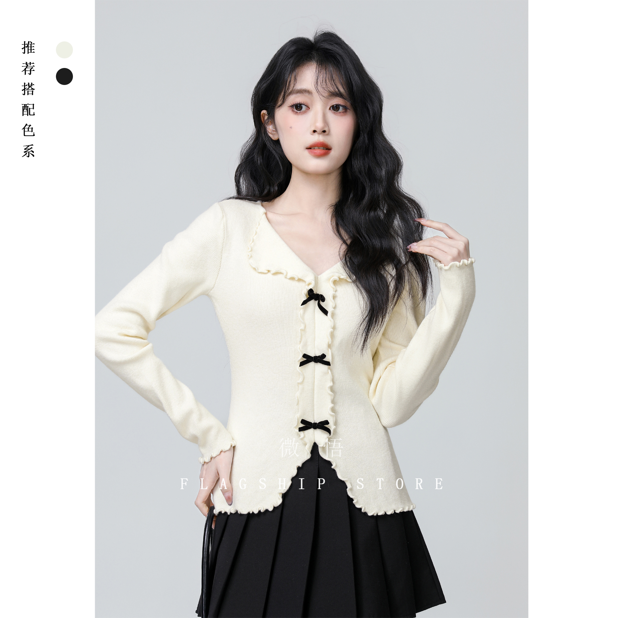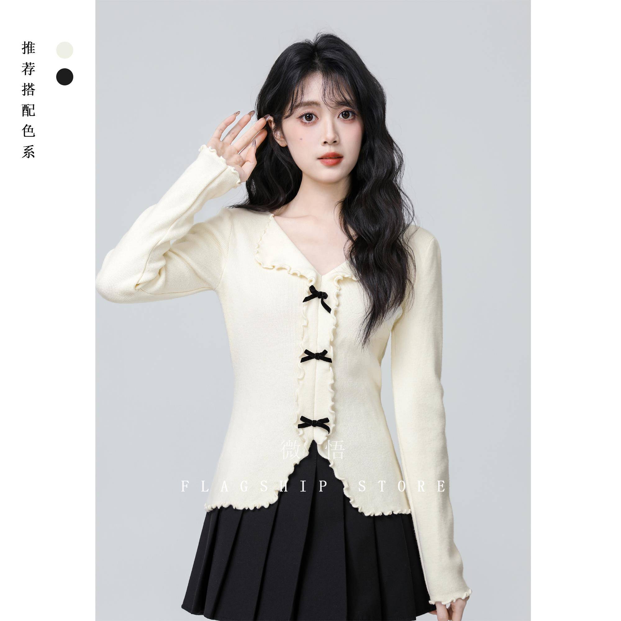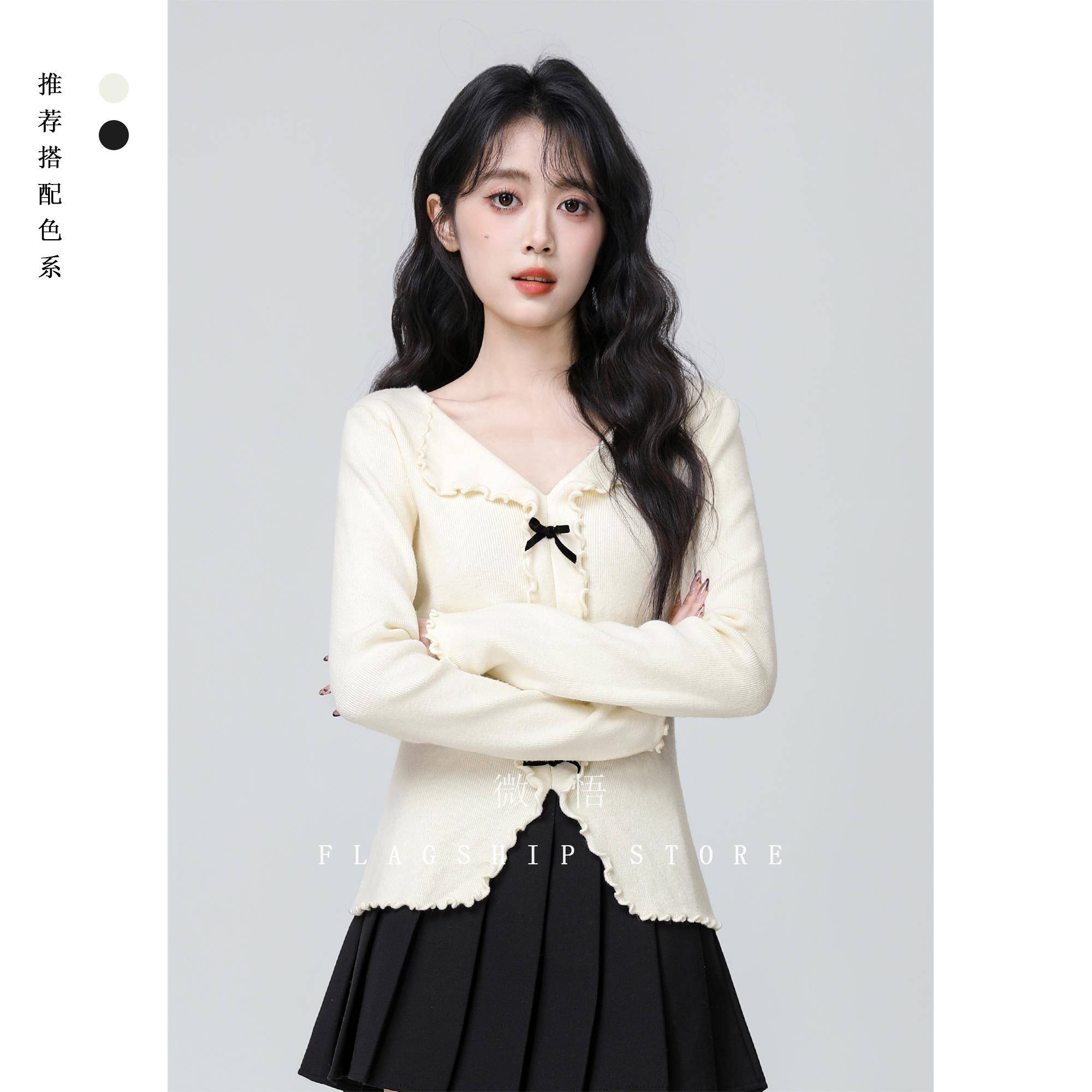 杏色不规则长袖针织衫女春秋2025春新款木耳边V领打底衫别致上衣