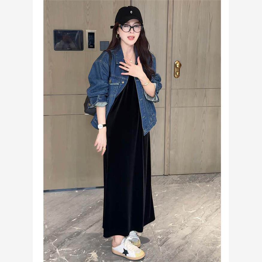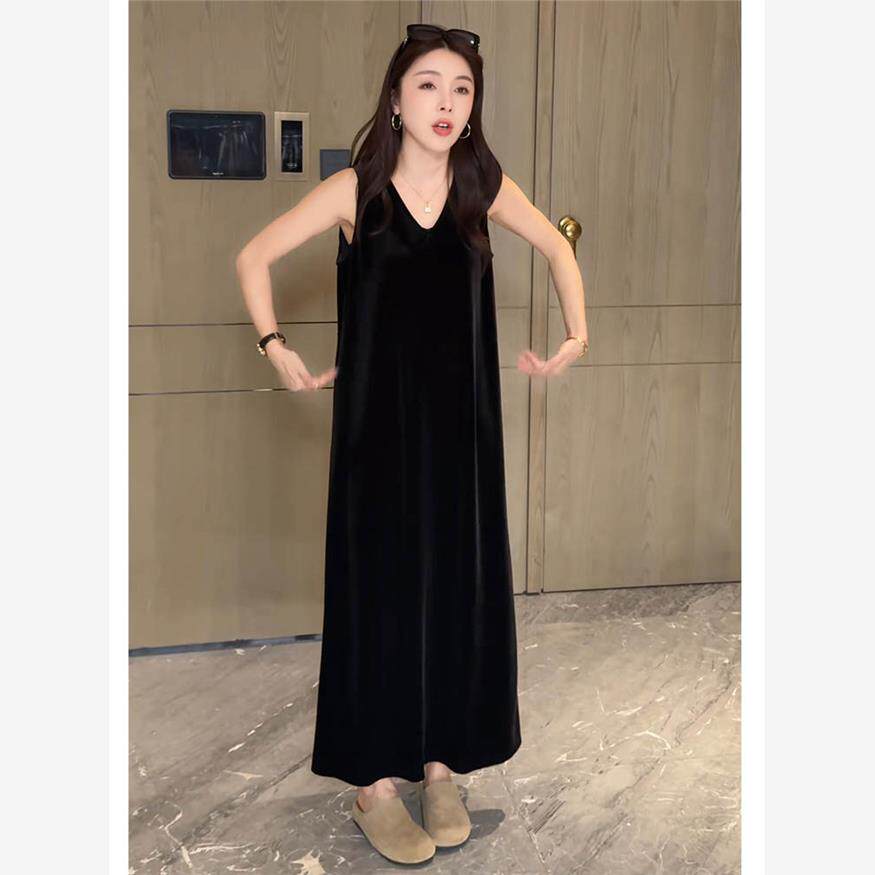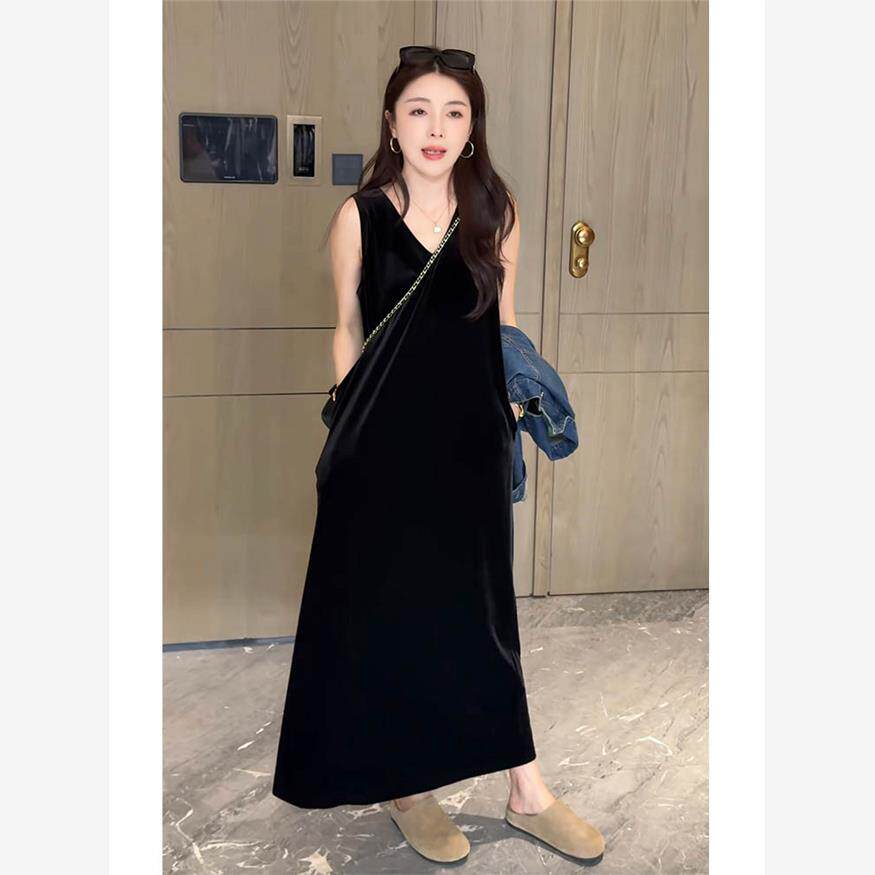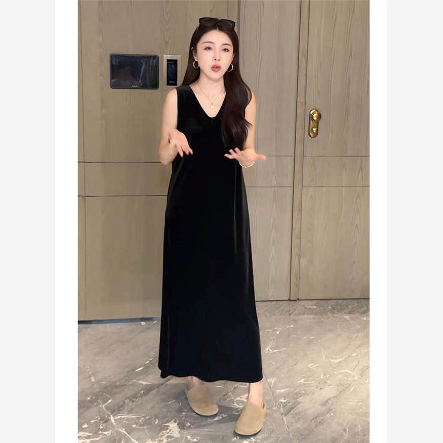 2025秋冬新款显瘦无袖丝绒连衣裙女气质V领慵懒风百搭长款小黑裙