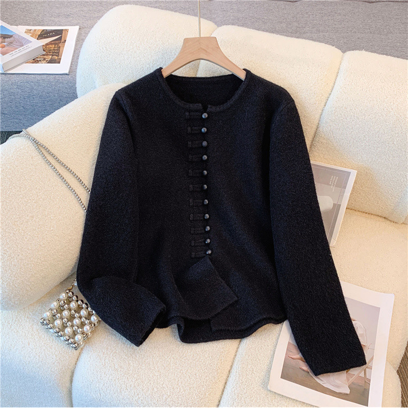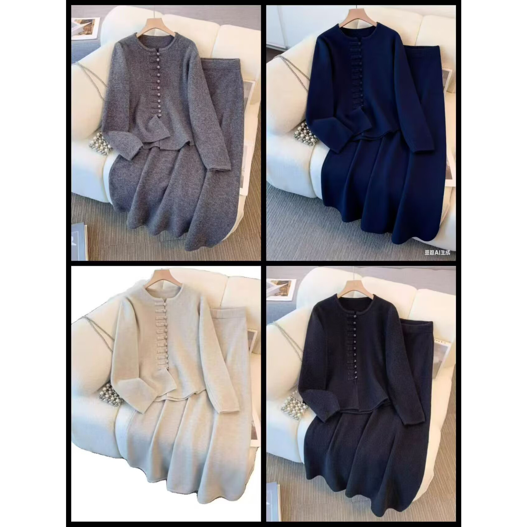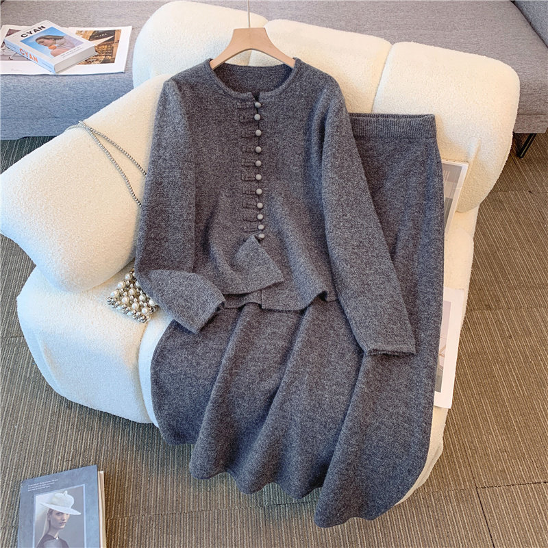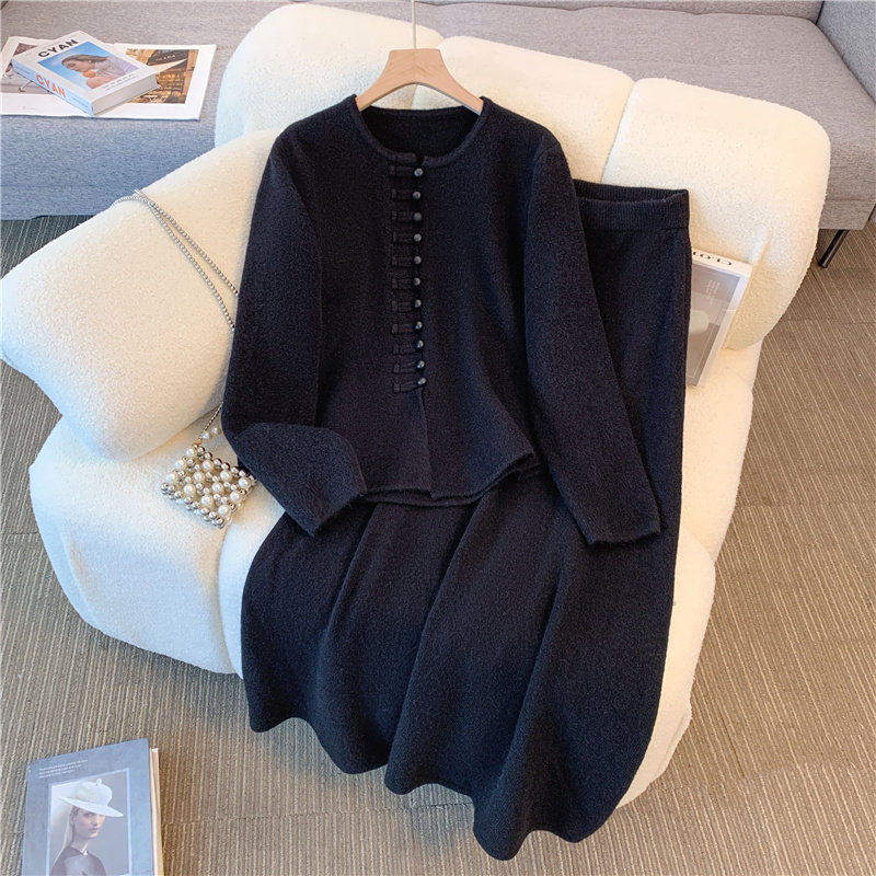 米白色新中式两件套装大码女秋装2025新款国风针织开衫上衣半身裙
