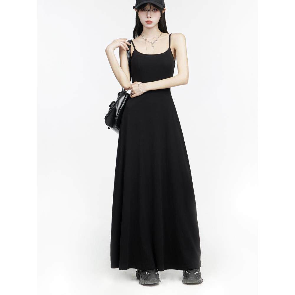 黑色细绳吊带连衣裙女2025夏季新款小个子收腰显瘦中长款裙子