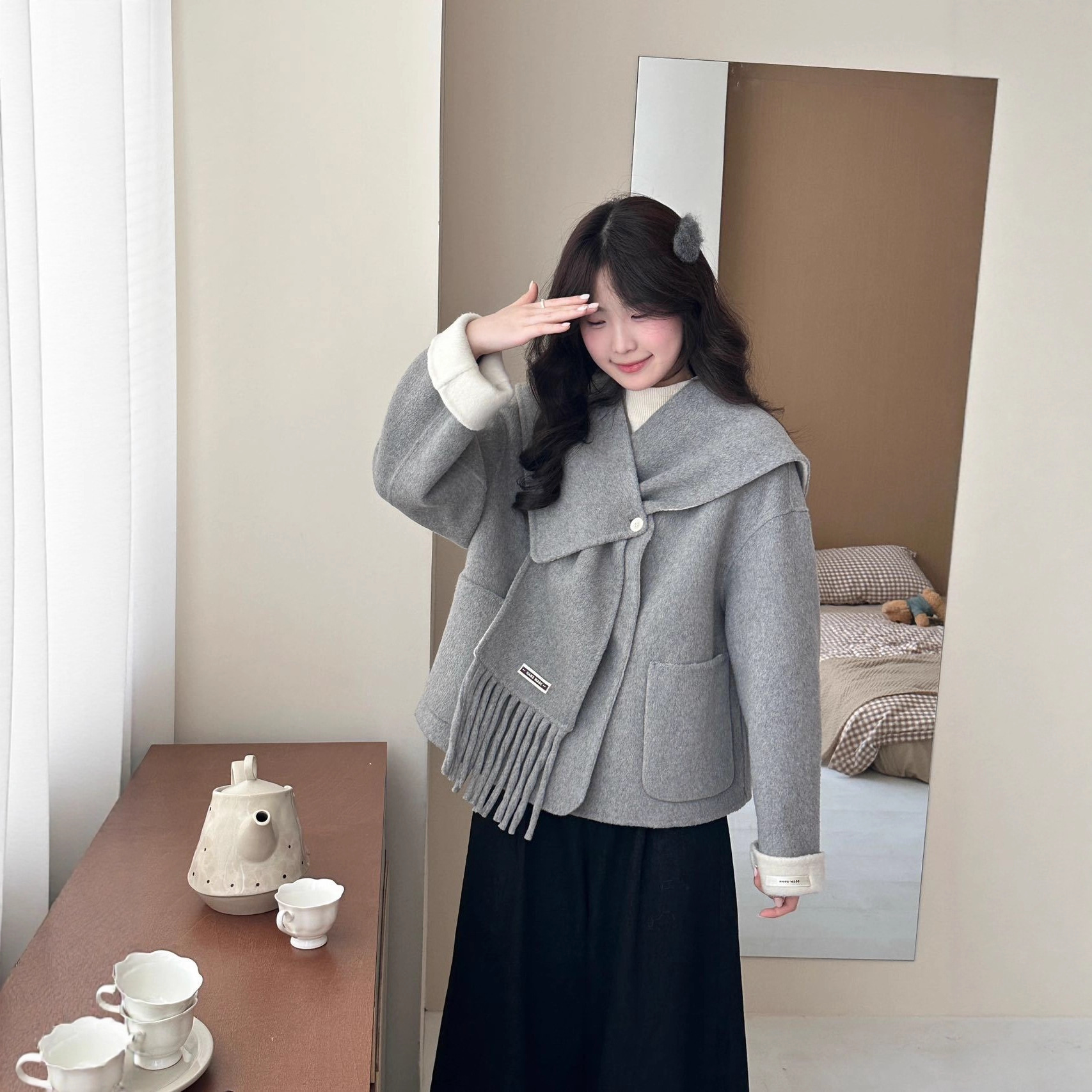 2025新款围巾领可脱卸双面羊毛大衣 小个子加厚保暖流苏羊绒外套