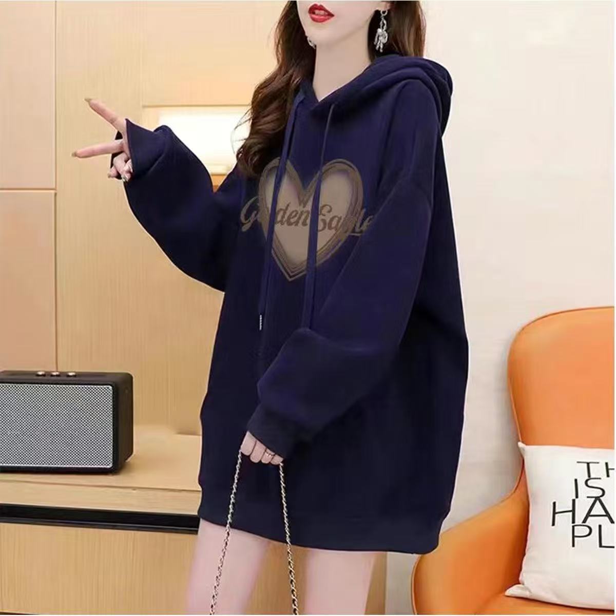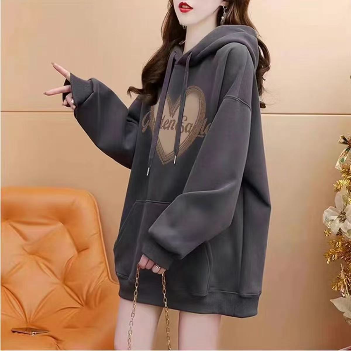 酒红色连帽潮流印花学生卫衣秋冬新款慵懒风设计感宽松套头上衣