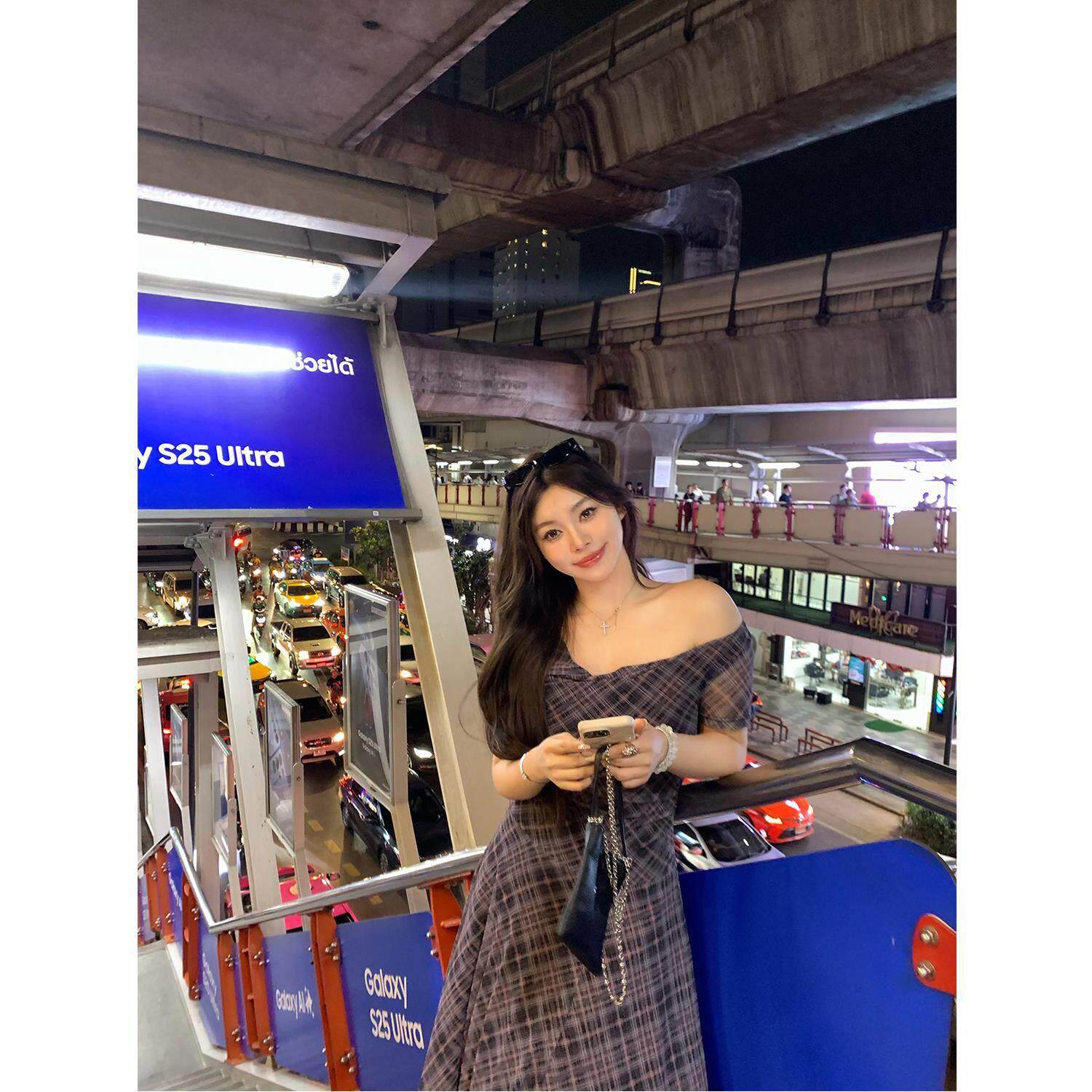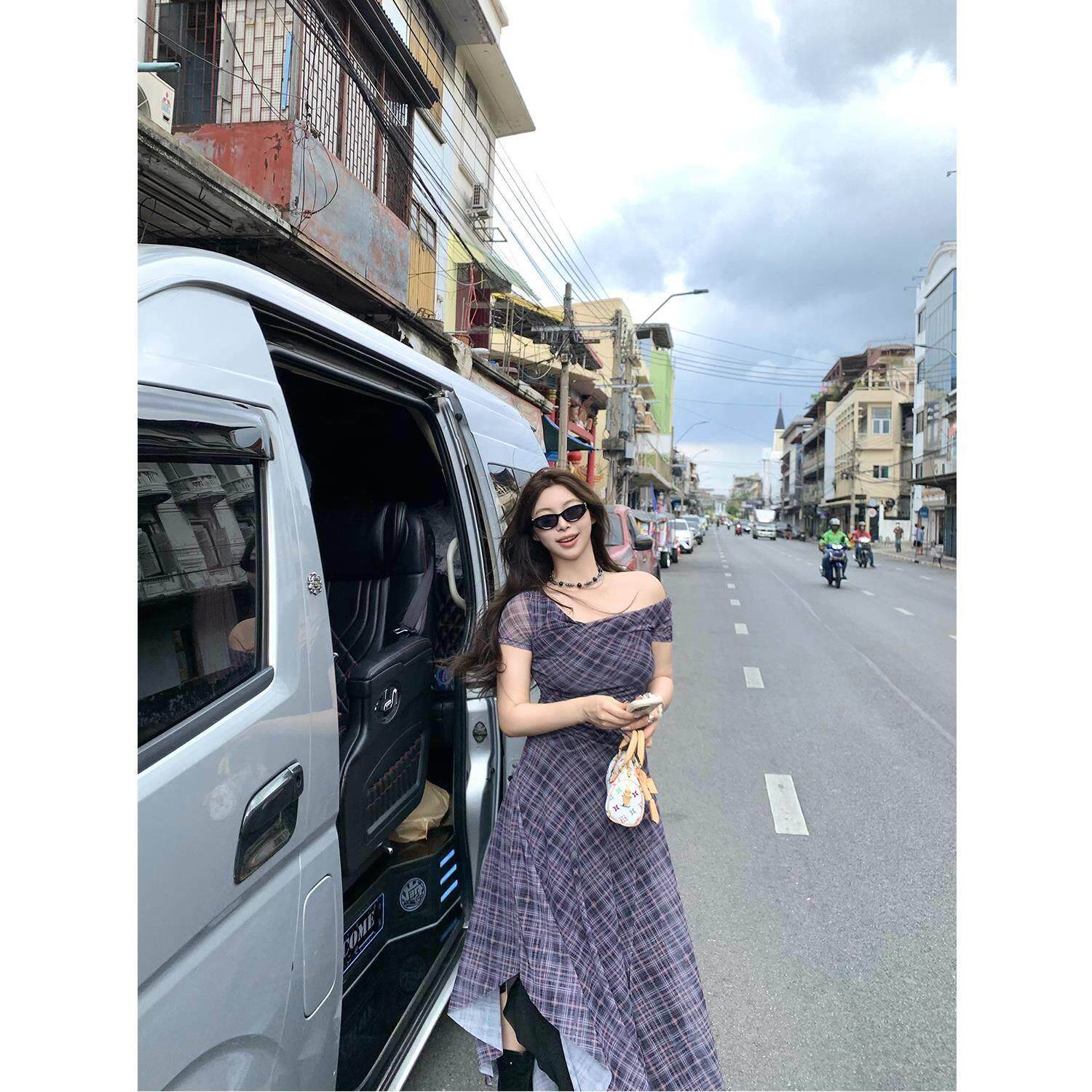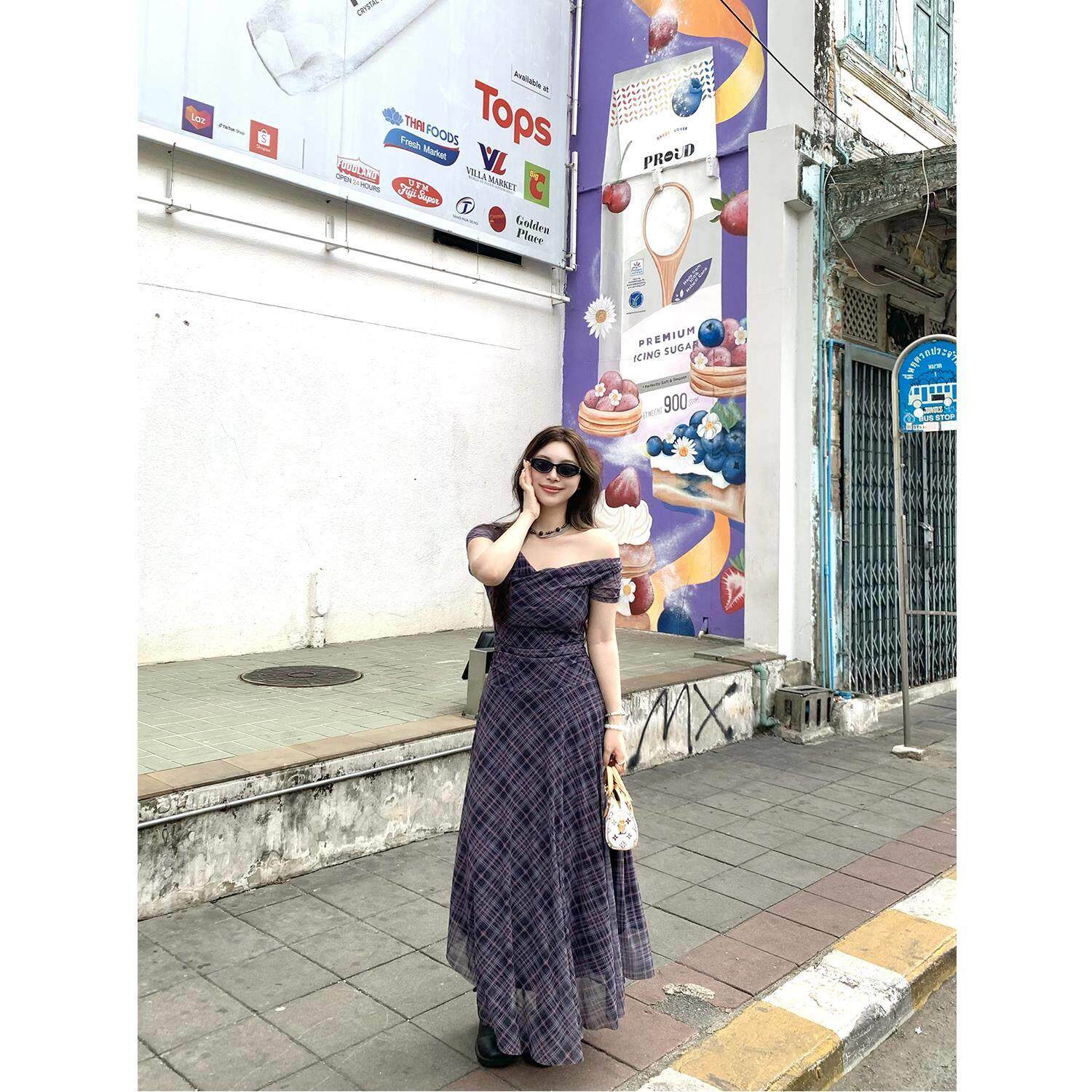 野生辣辣 氧气一夏 美式复古不规则格子荡领大码连衣裙甜辣A字裙