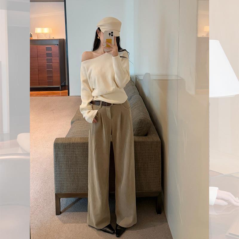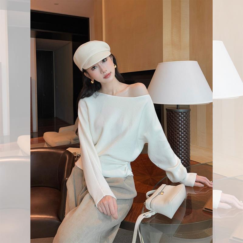 法式斜肩长袖针织衫女春秋季高级感超好看内搭打底收腰小个子上衣