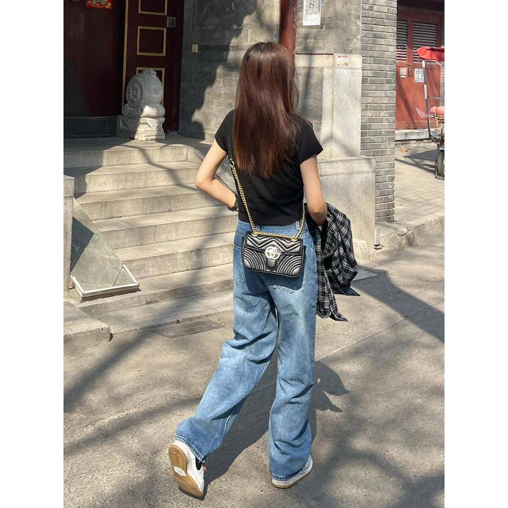 美式覆古蓝色牛仔裤女小个子2025春秋新款高腰显瘦加长直筒阔腿裤