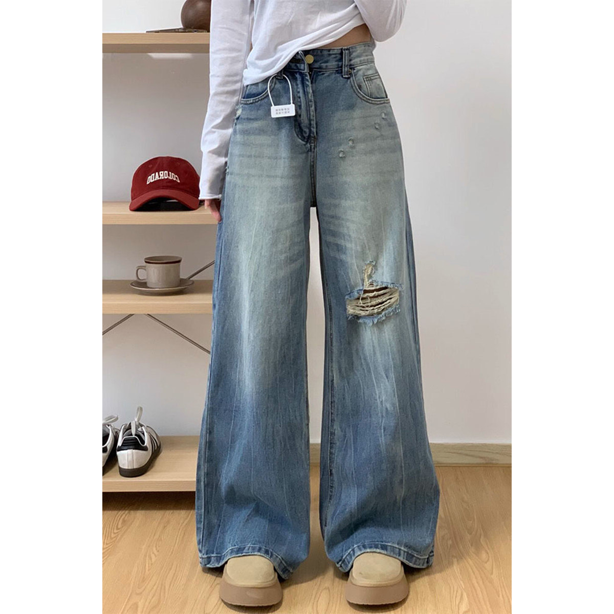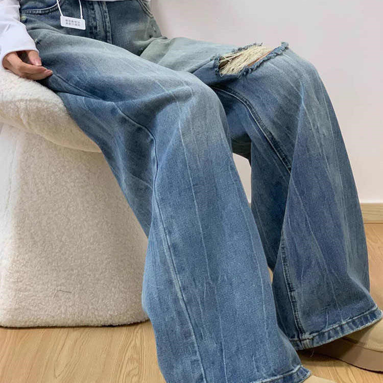 首页> 女装> 美式折痕破洞牛仔裤女2025新款夏秋季高腰直筒垂感拖地阔腿长裤子