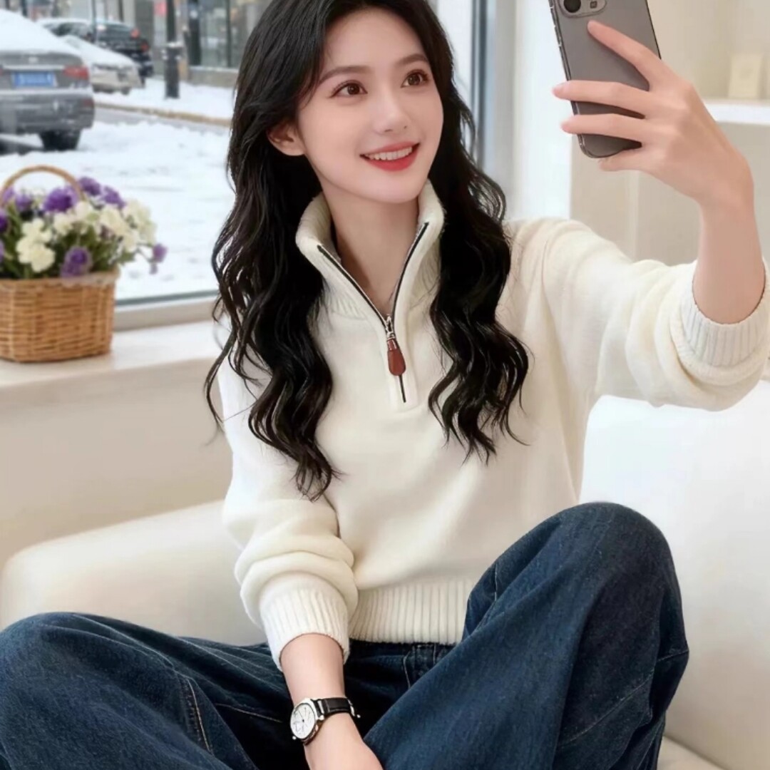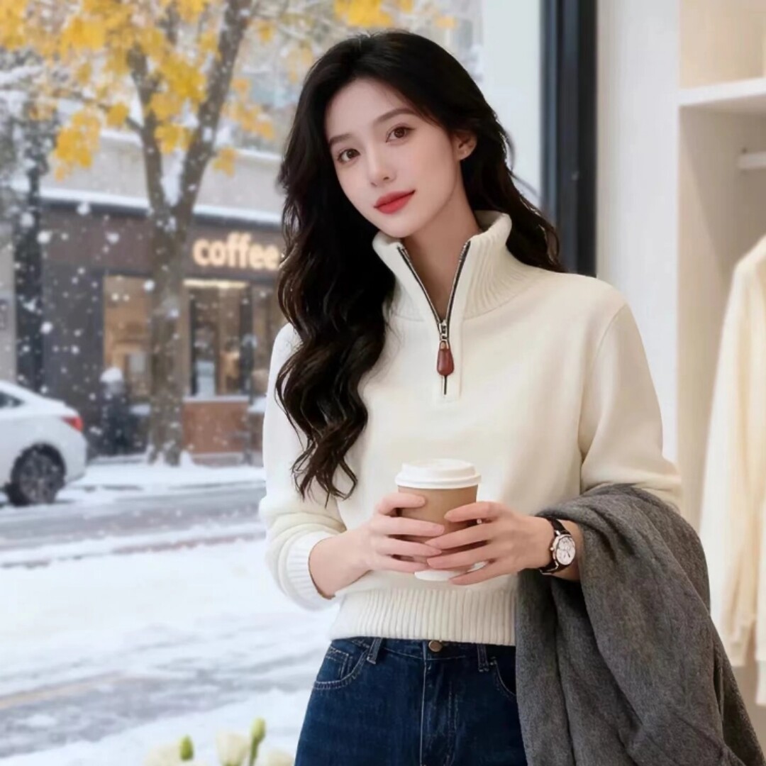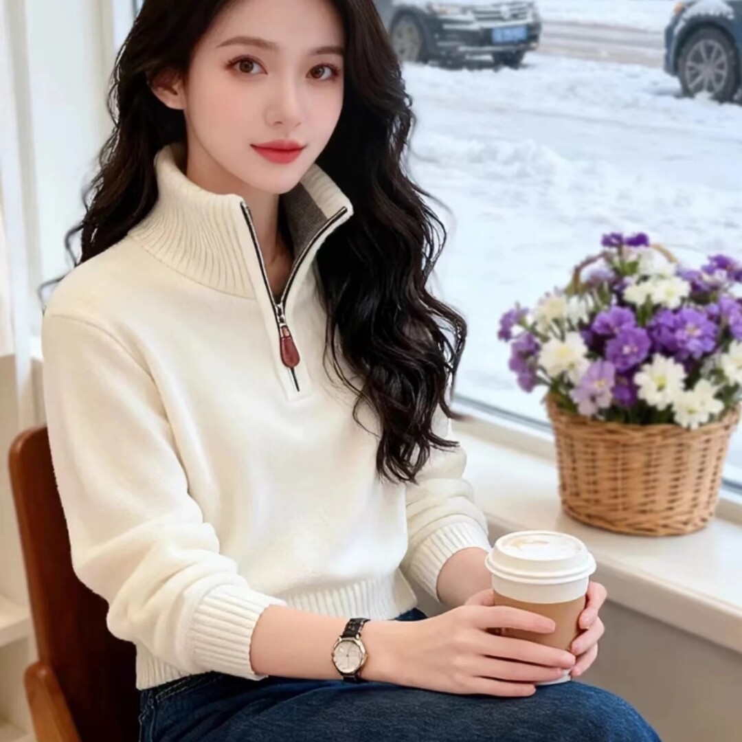 白色半拉链立领针织毛衣长袖T恤女2025新款巨好看的冬装内搭上衣
