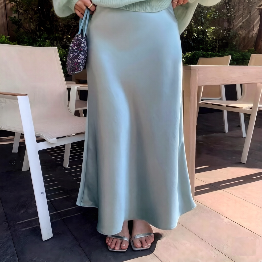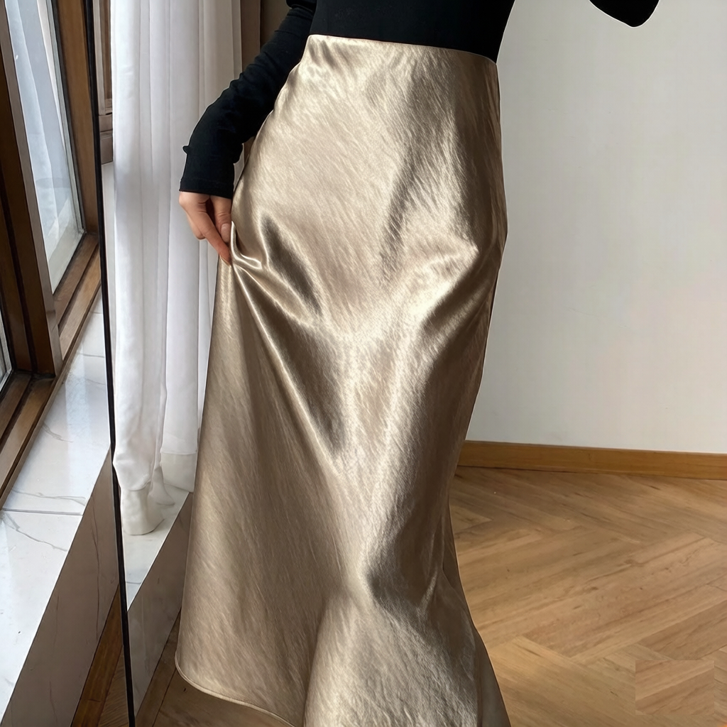 鎏光鱼尾裙仿醋酸缎面鎏金半身裙松紧腰高腰法式垂坠纯白长裙子