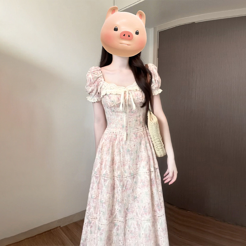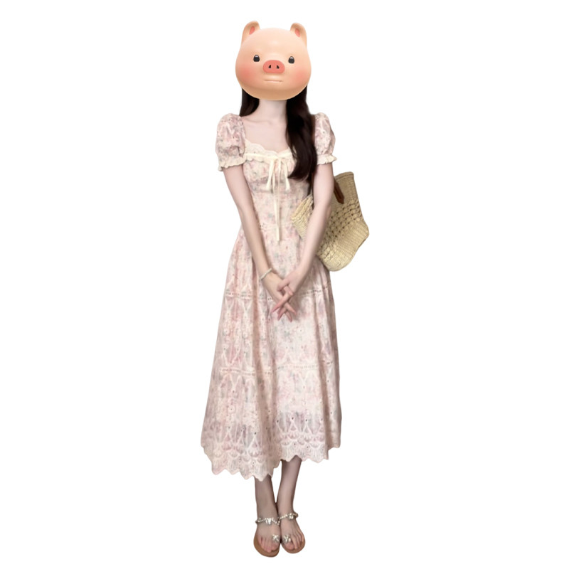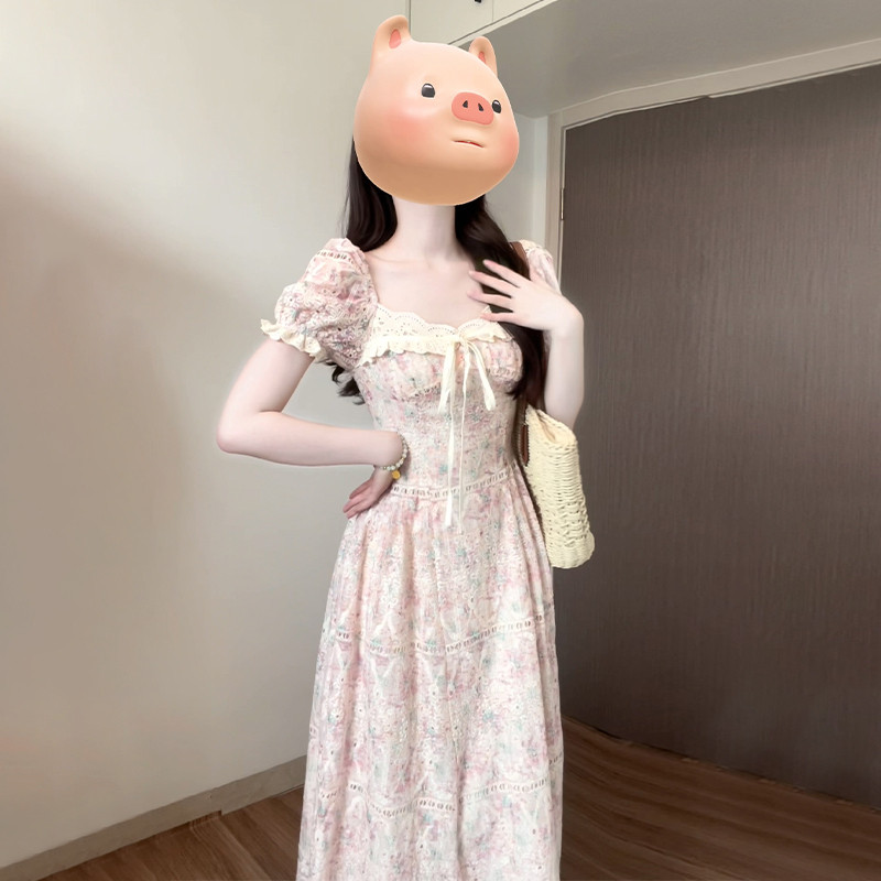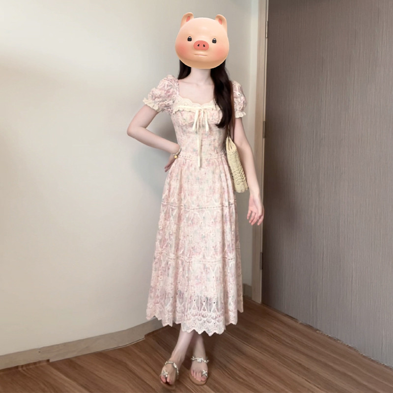 粉色刺绣碎花仙女连衣裙子2024新款夏季方领泡泡袖高级感法式长裙