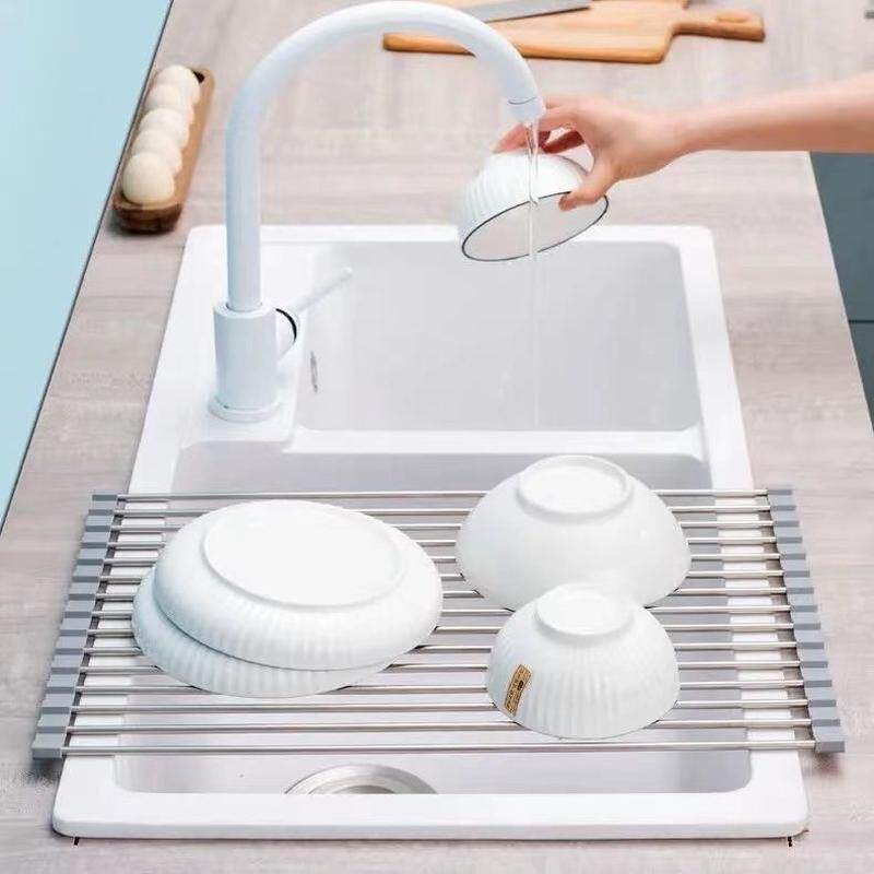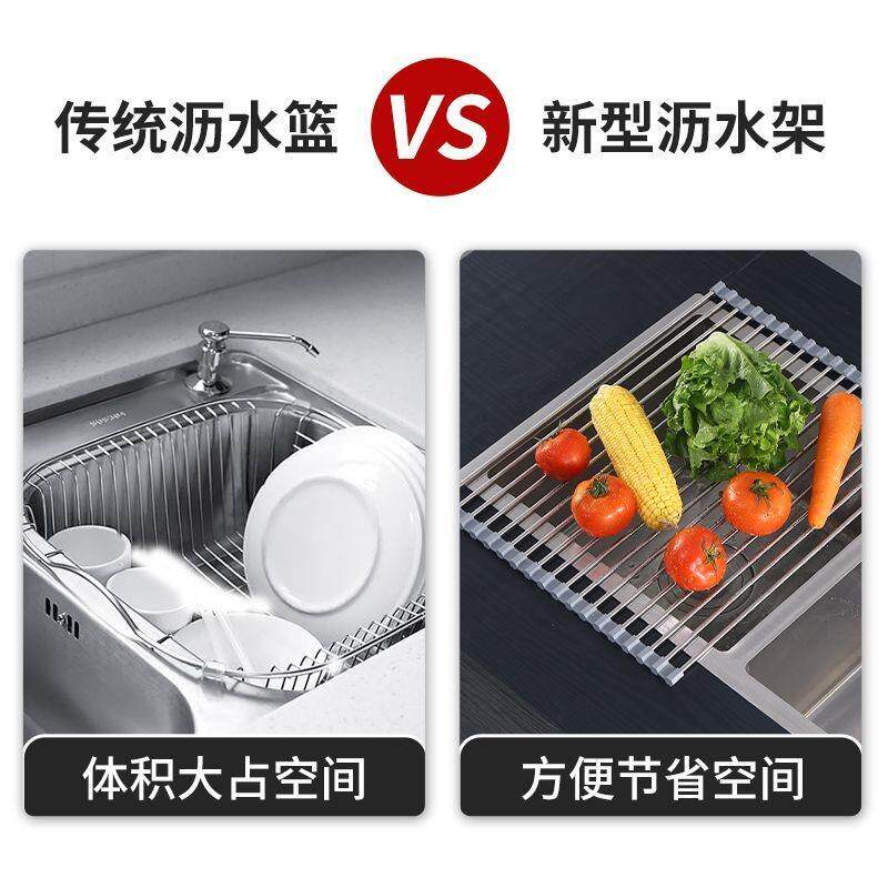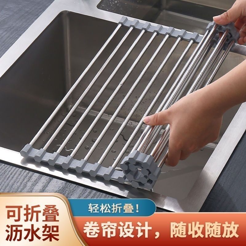 爆款!网红不锈钢沥水卷帘沥水碗碟收纳厨房水槽板硅胶置物架可折