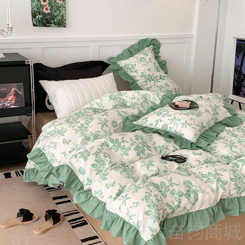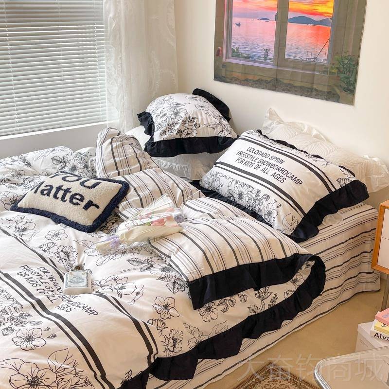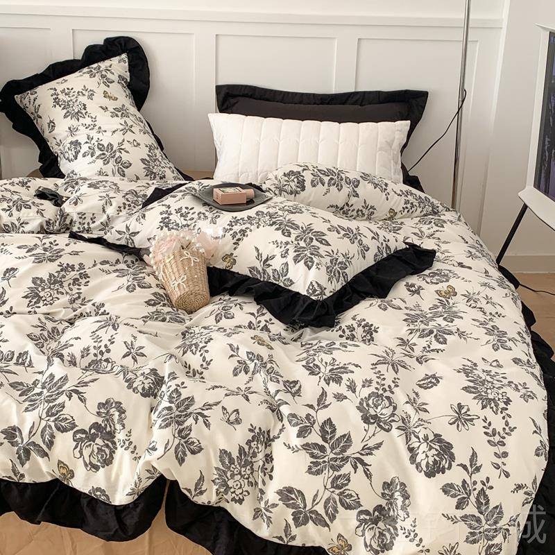 正品ins复古赫本风女黑素白描花全棉上四件套床 韩国小仙纯棉被套
