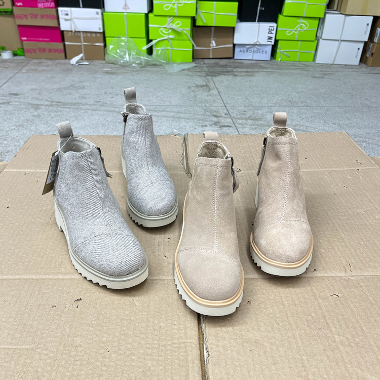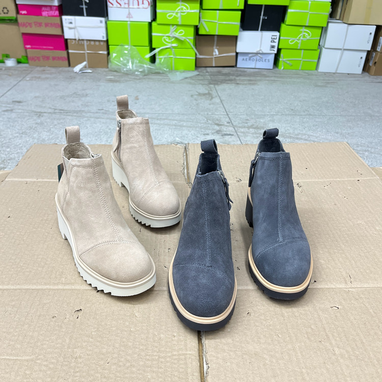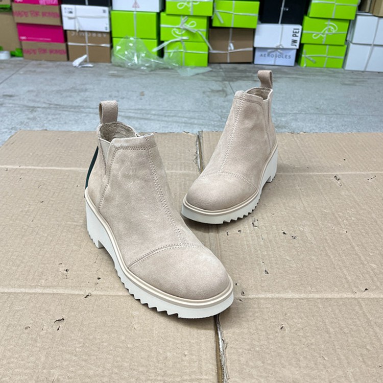 外贸原单女靴新款真皮时尚圆头纯色松糕底百搭侧拉链短靴及踝靴
