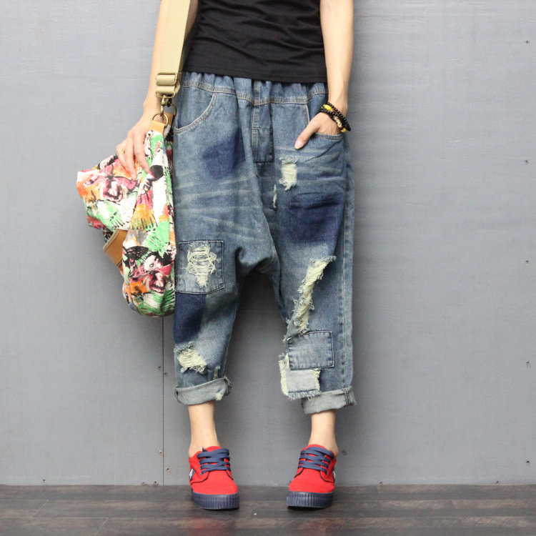 破洞潮大码烂牛仔休闲裤做旧深蓝色松紧腰宽松牛仔裤哈伦裤女垮裤