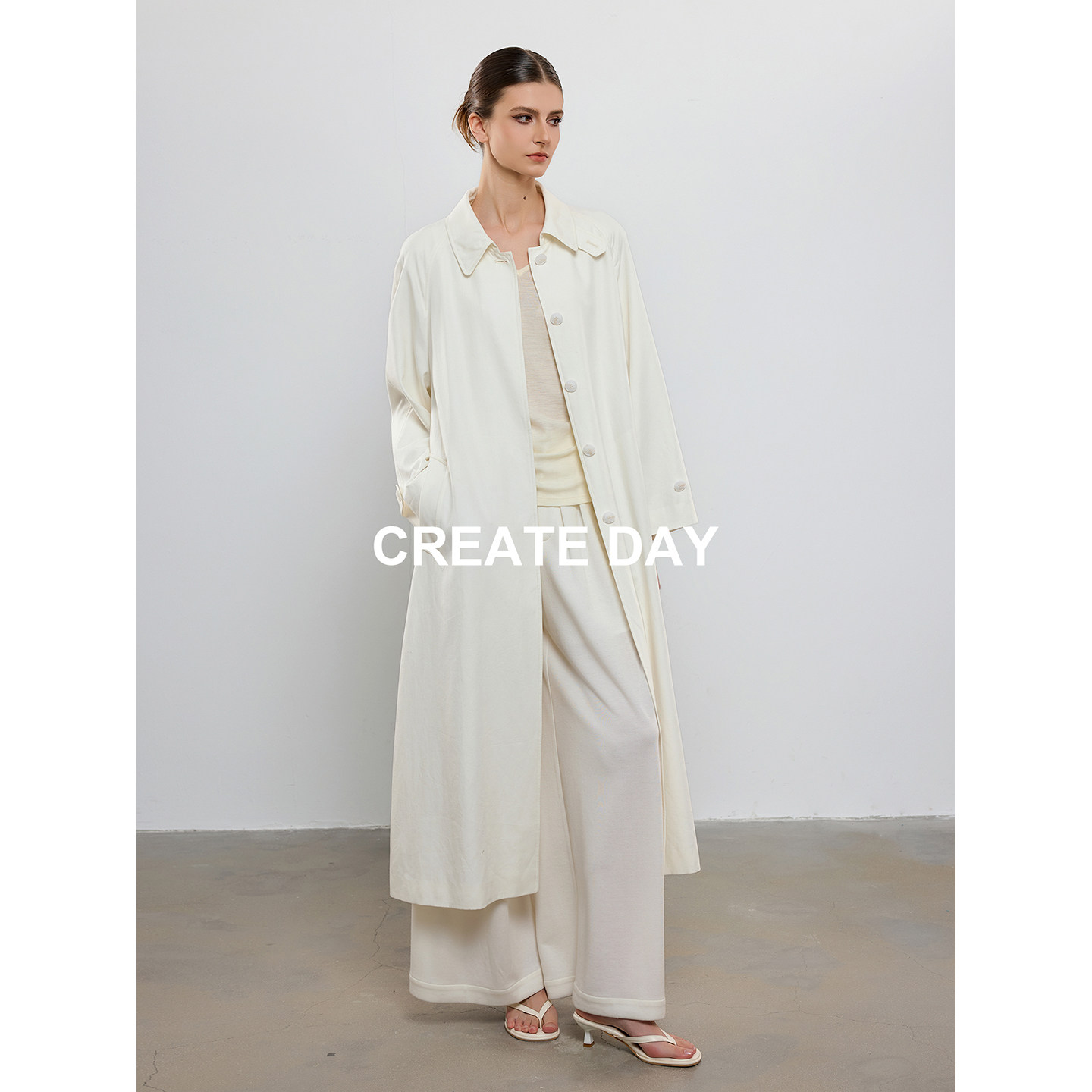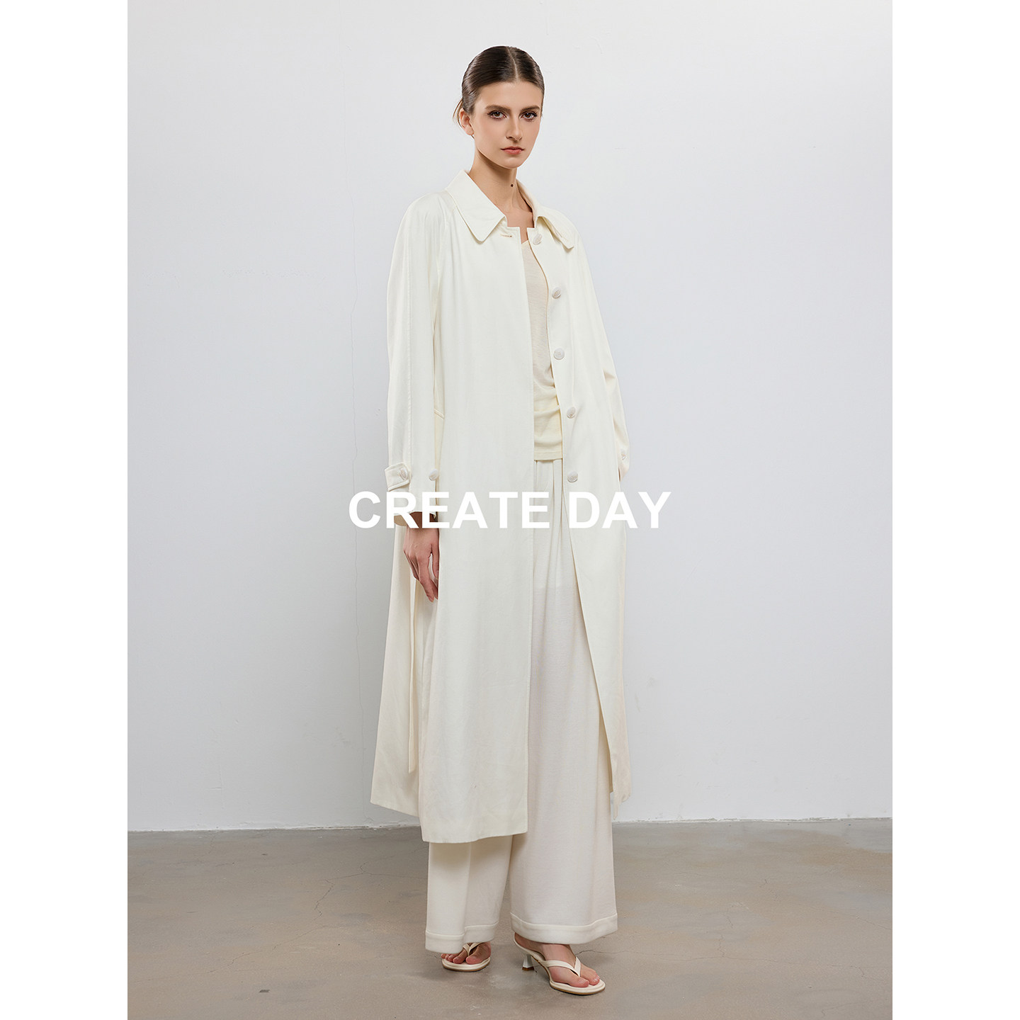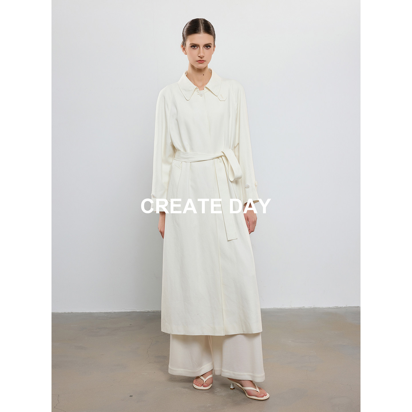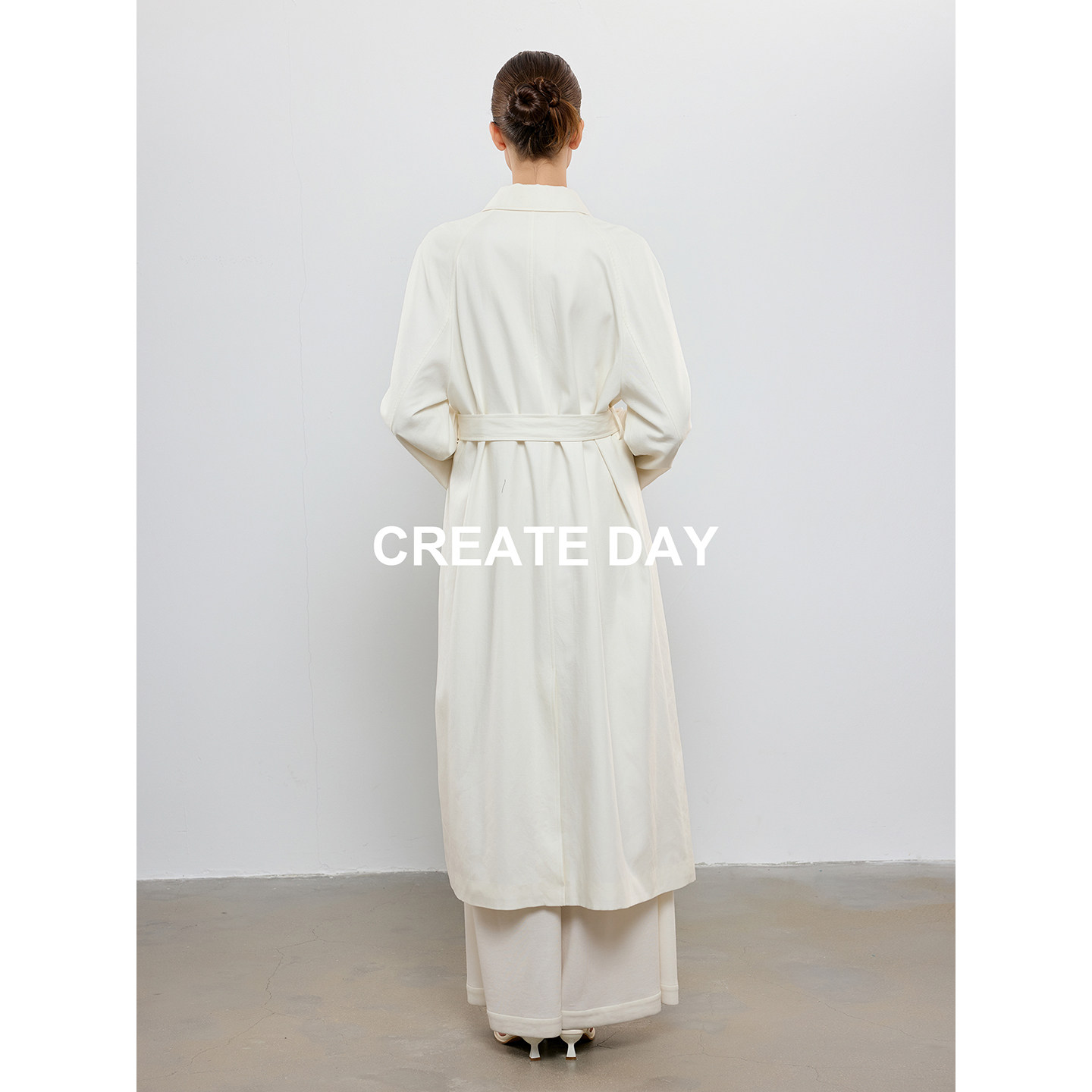 CREATE DAY 白色长款天丝风衣女秋冬ROW风气质收腰莱赛尔羊毛外套
