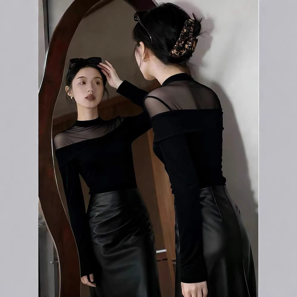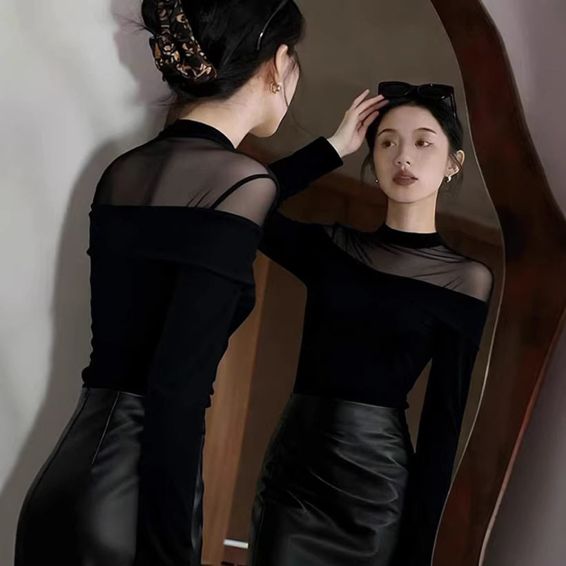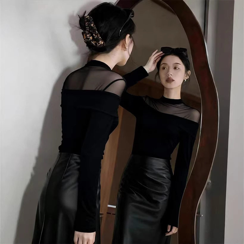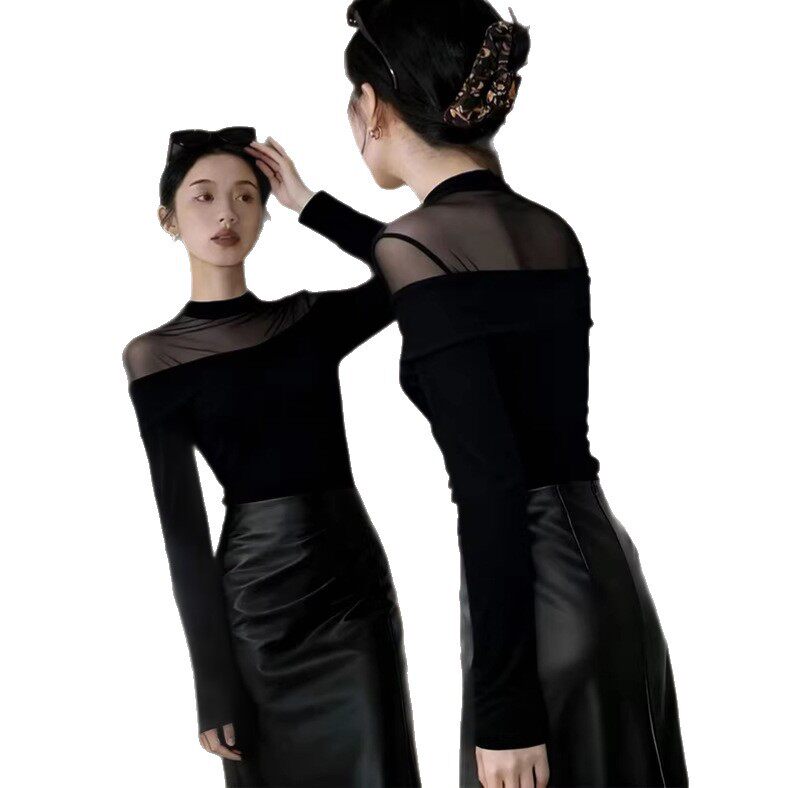 半高领纯欲辣妹修身网纱拼接v领打底衫女早春内搭长袖显瘦t恤上衣