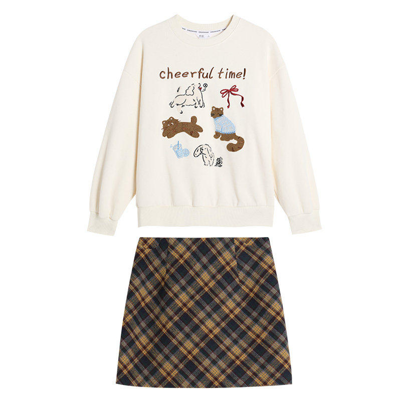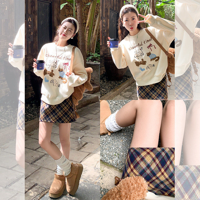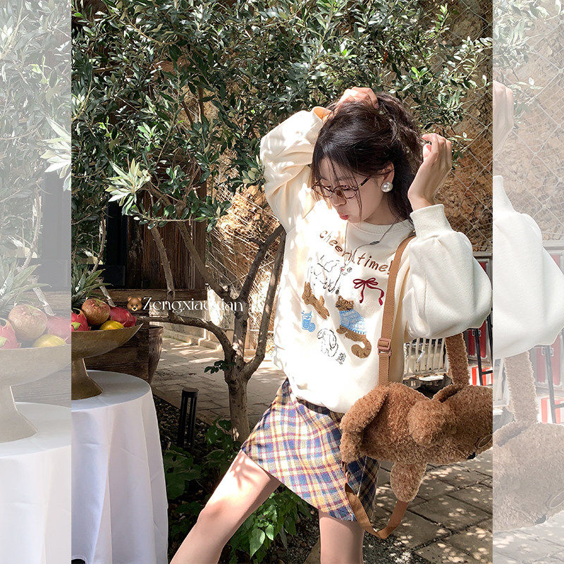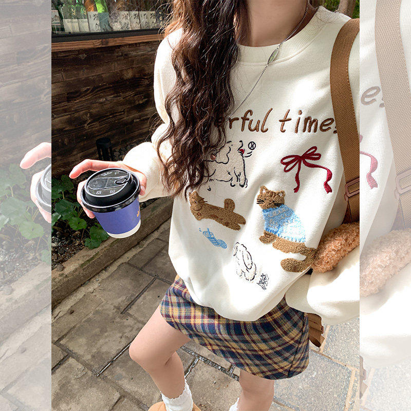 韩系刺绣无帽圆领卫衣女秋冬宽松慵懒风长袖上衣加绒加厚