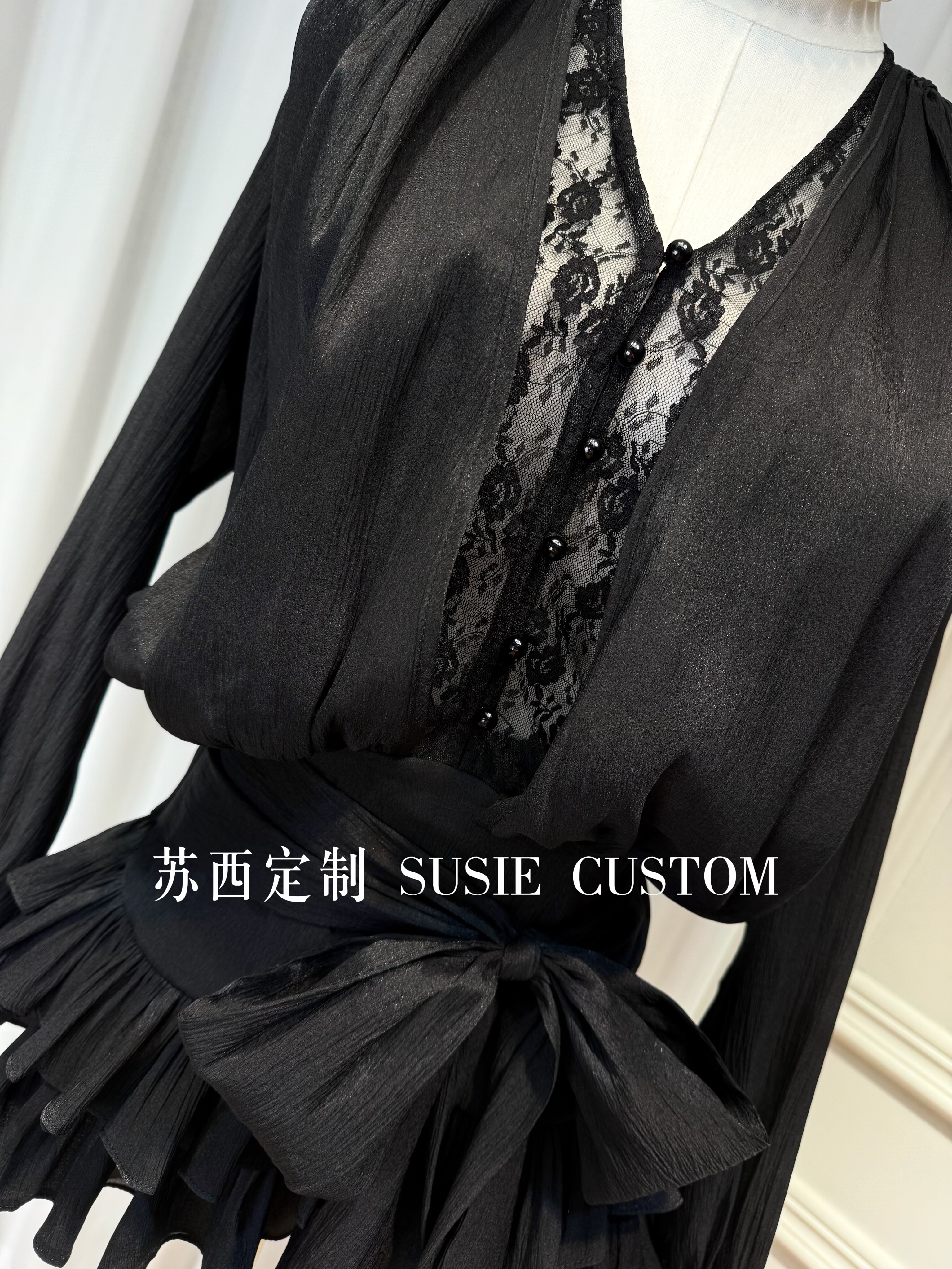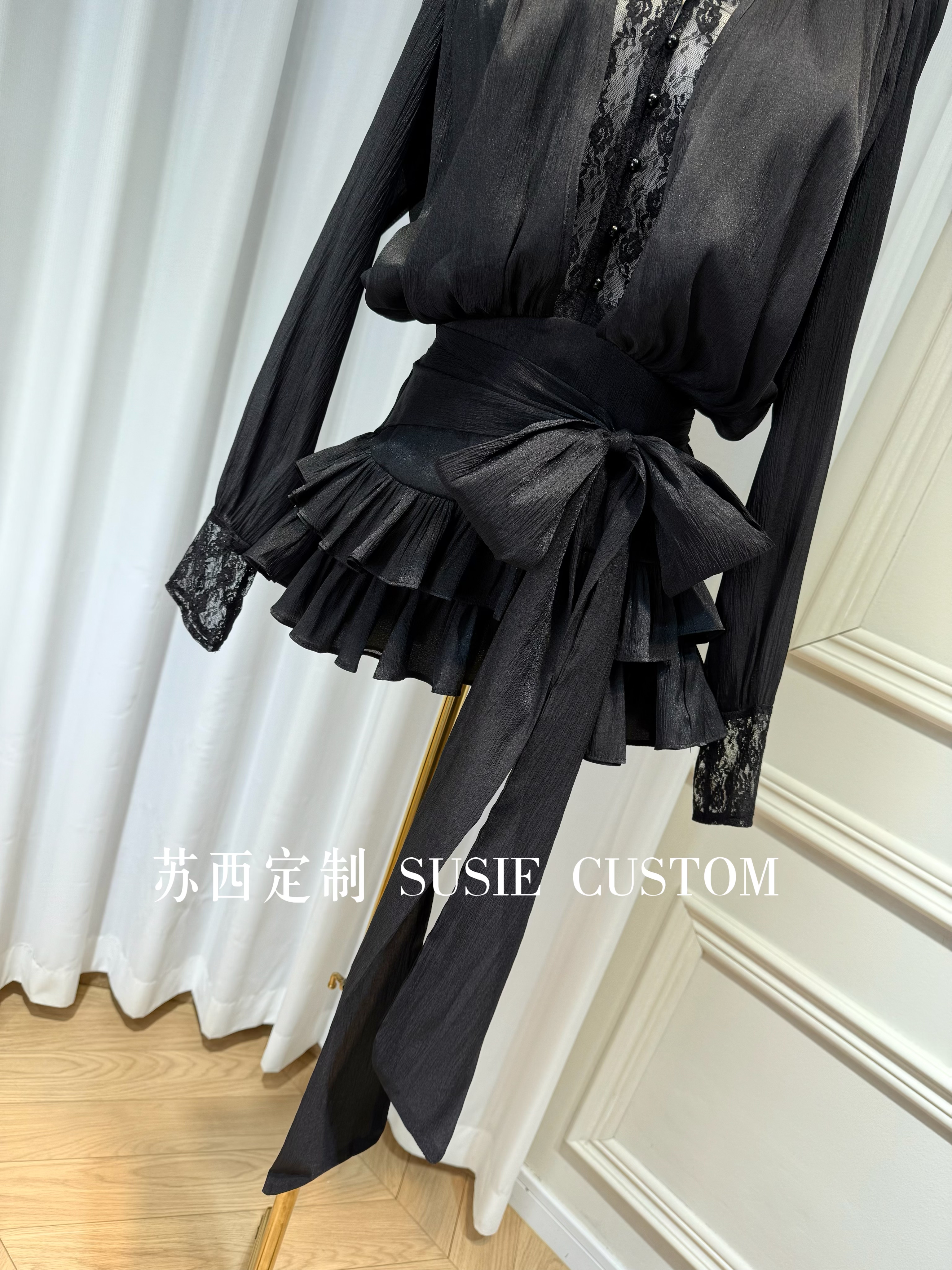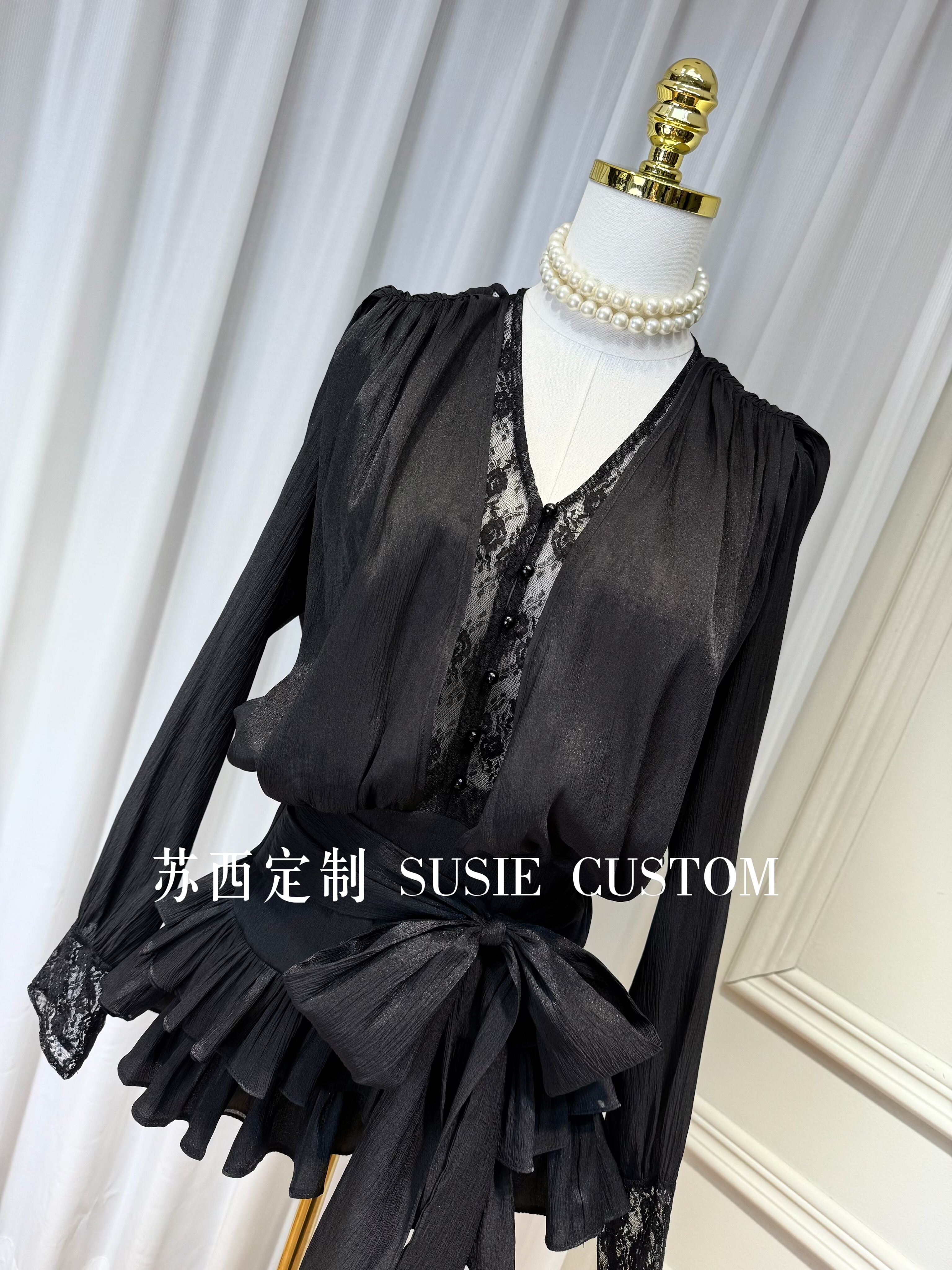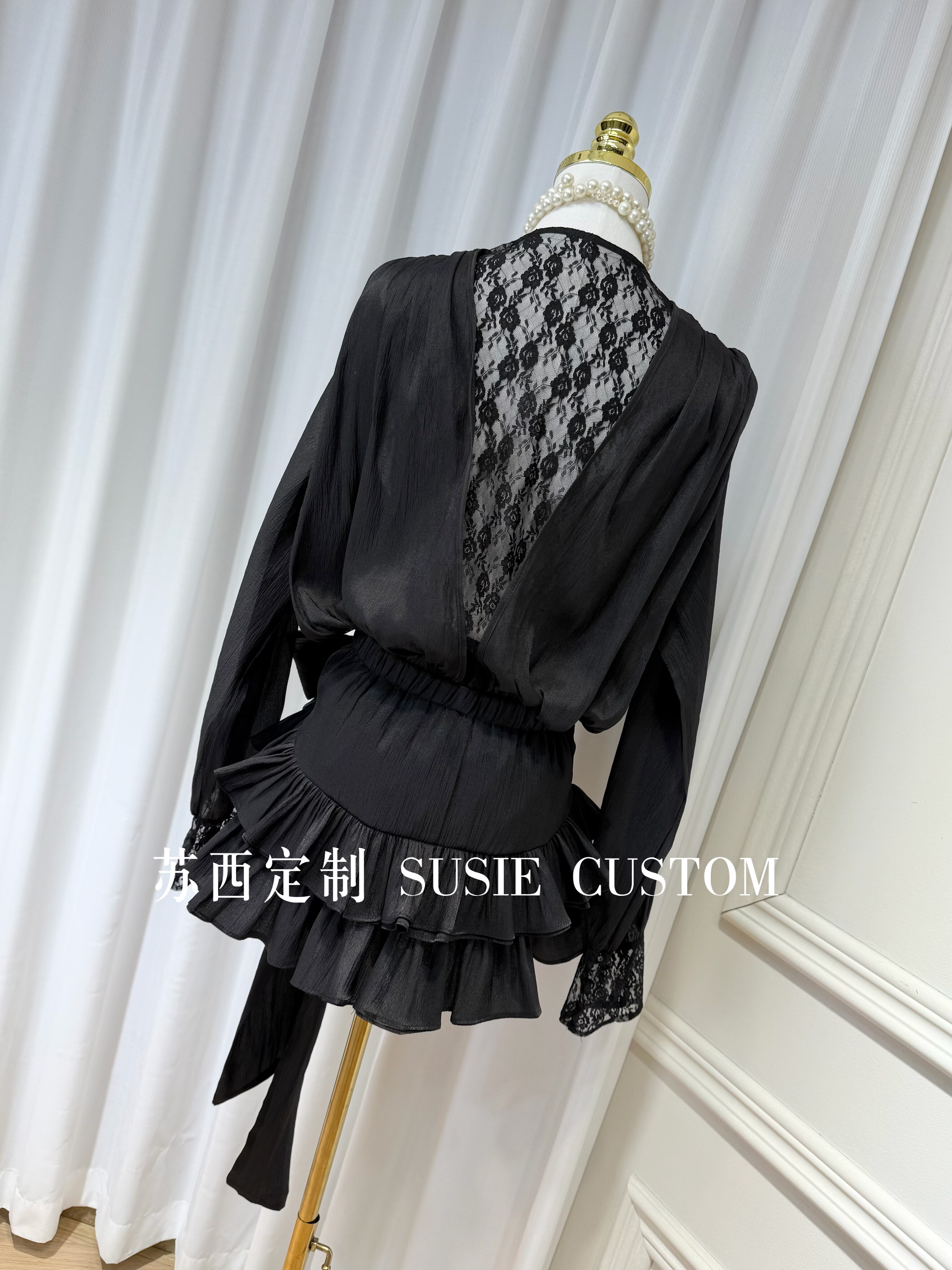 高定越南小众设计款微透V领蕾丝拼接蝴蝶绑带荷叶边短裙配打底裤