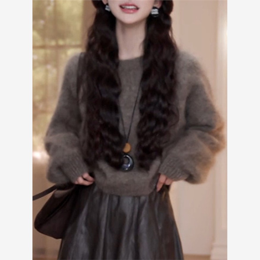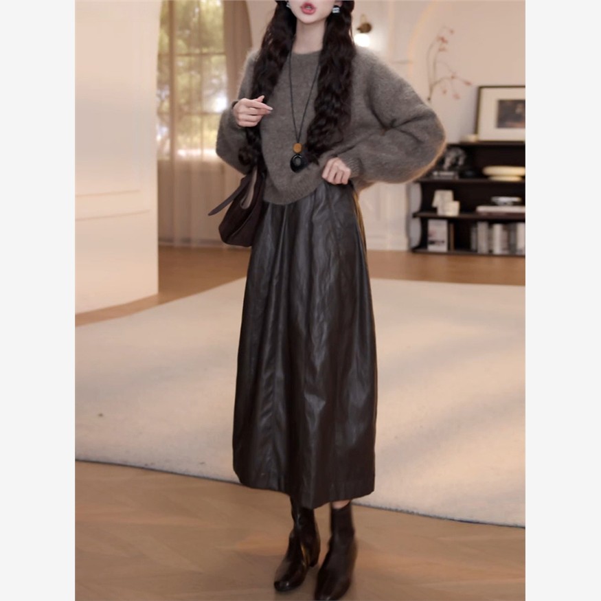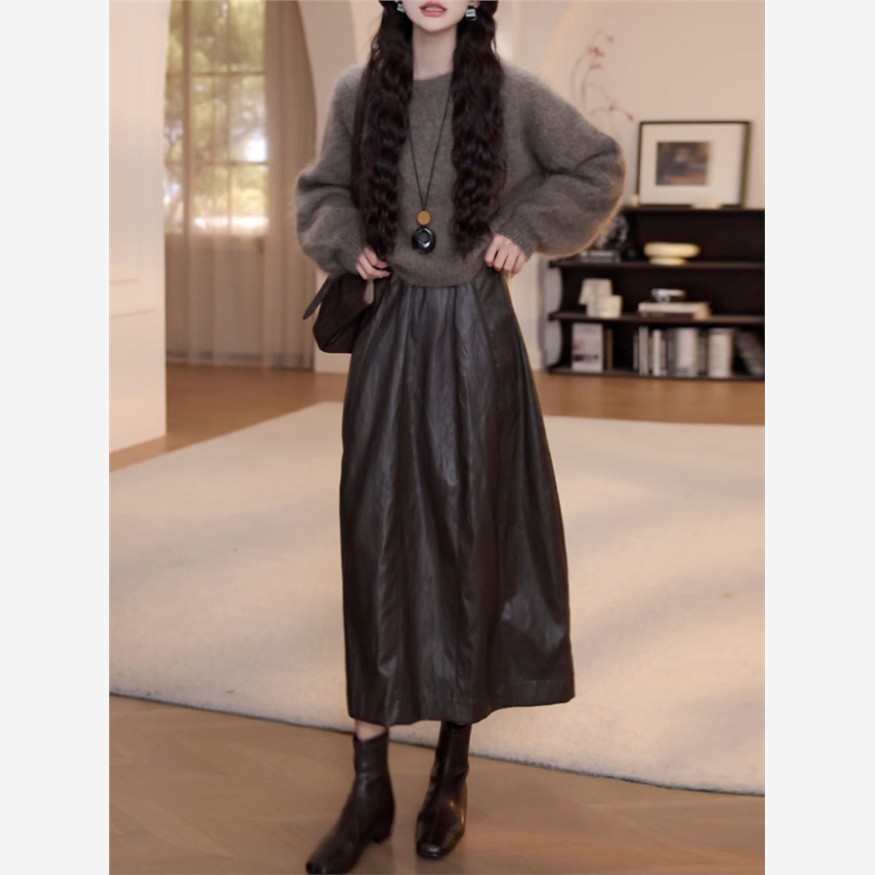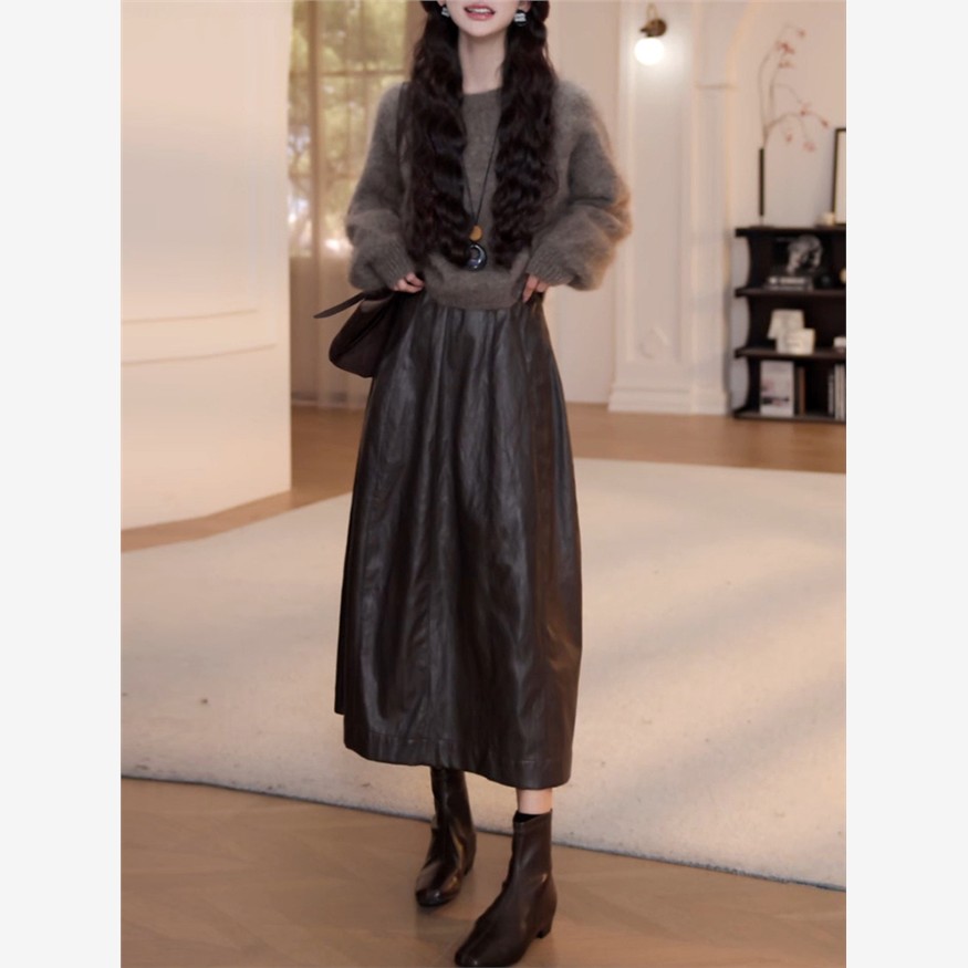 巨好看的秋装搭配一整套2025新款套头软糯针织衫半身皮裙两件套女