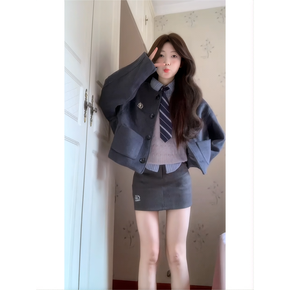 【通勤复古】韩系休闲短外套+短裙两件套女秋冬新款简约时尚套装~
