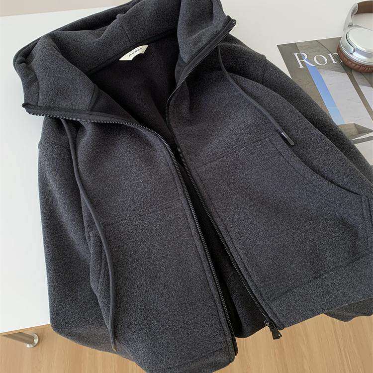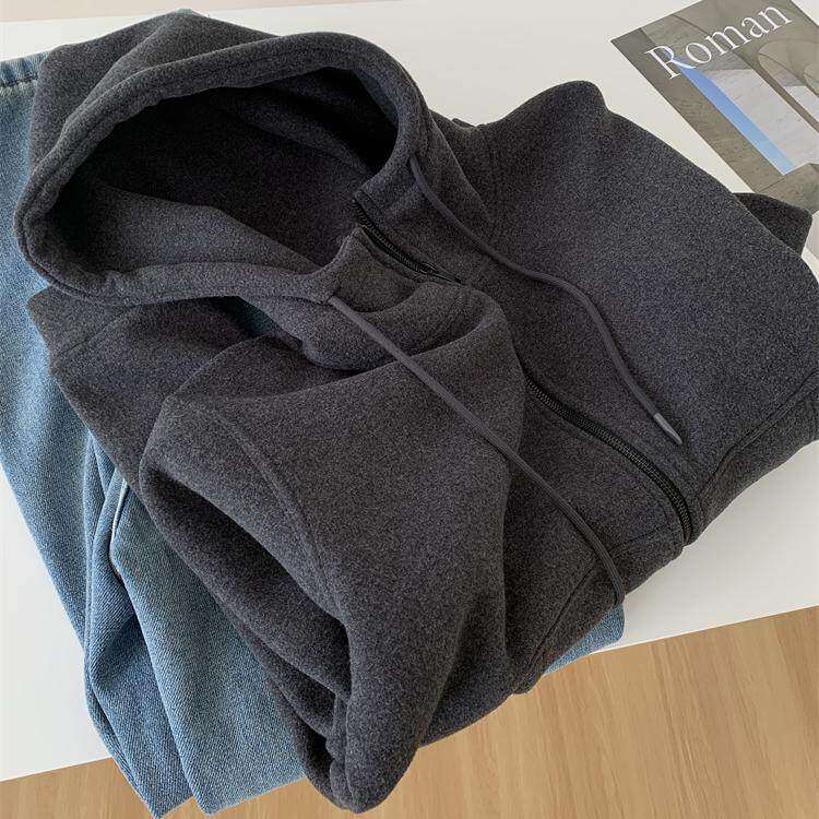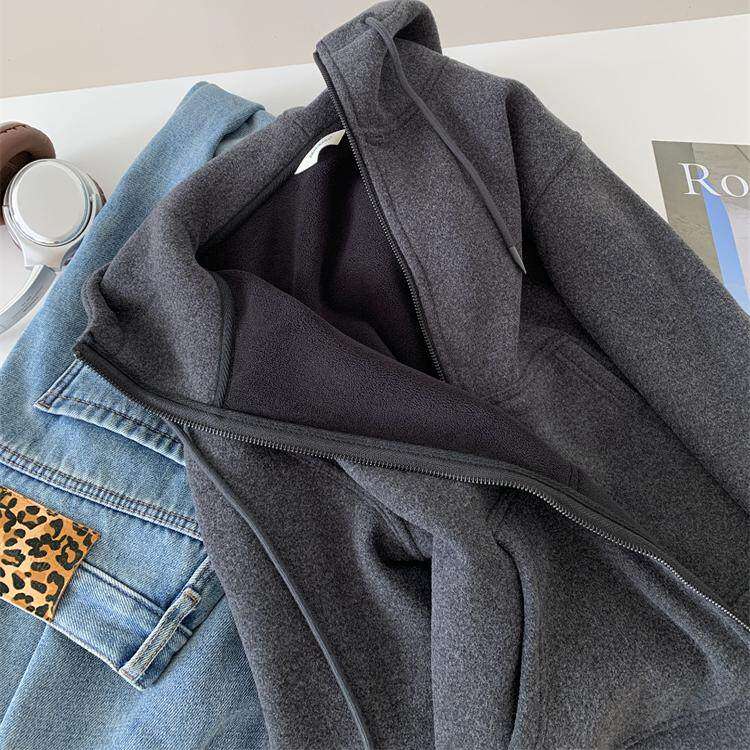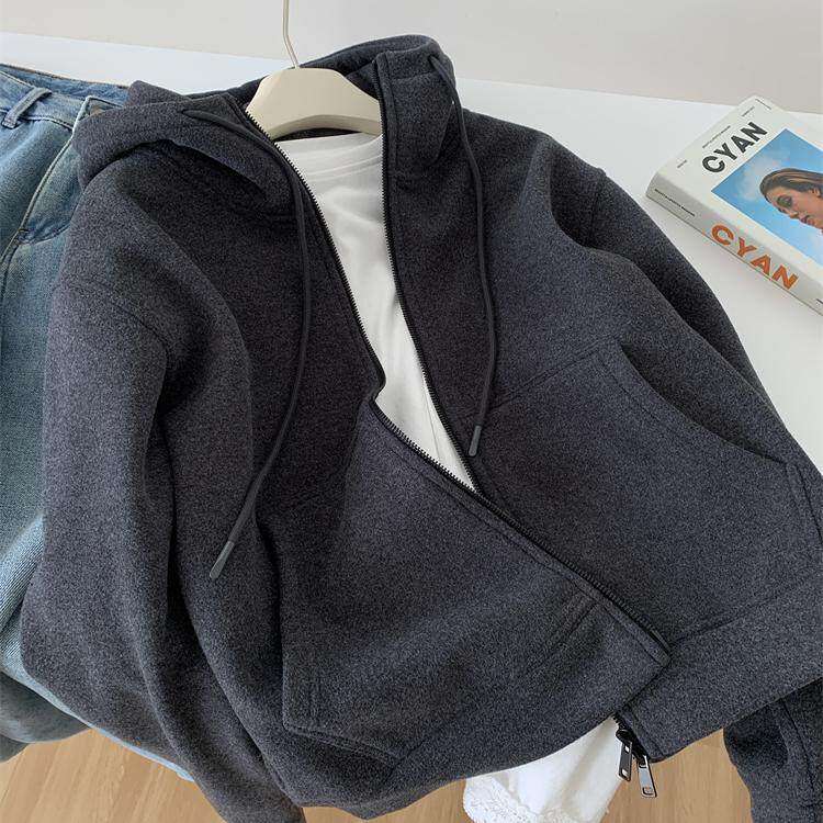重磅加厚深灰色卫衣外套女气质慵懒保暖百搭秋冬韩版连帽拉链开衫