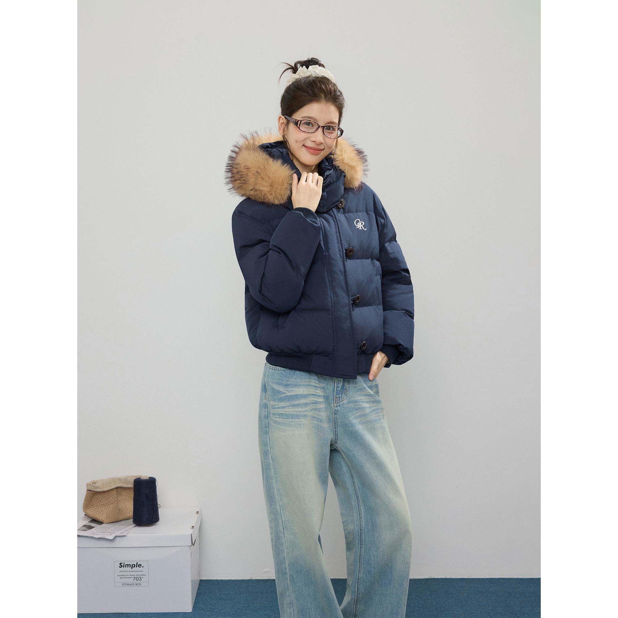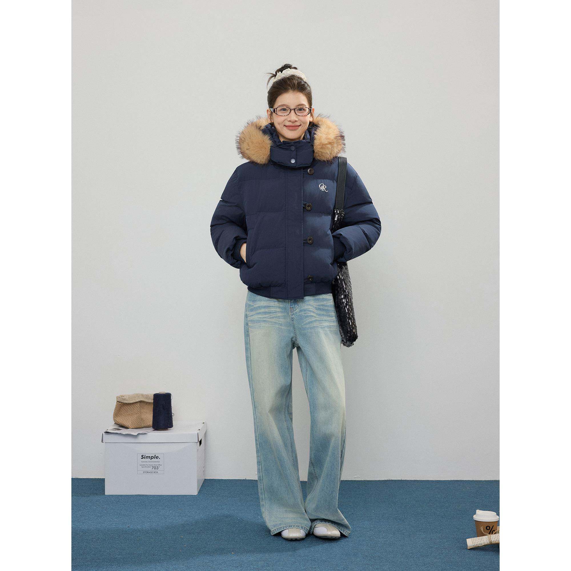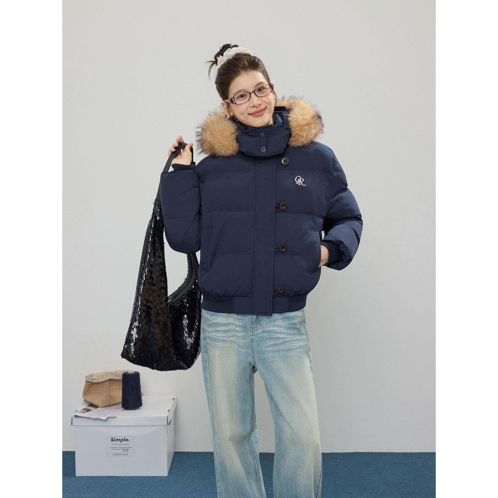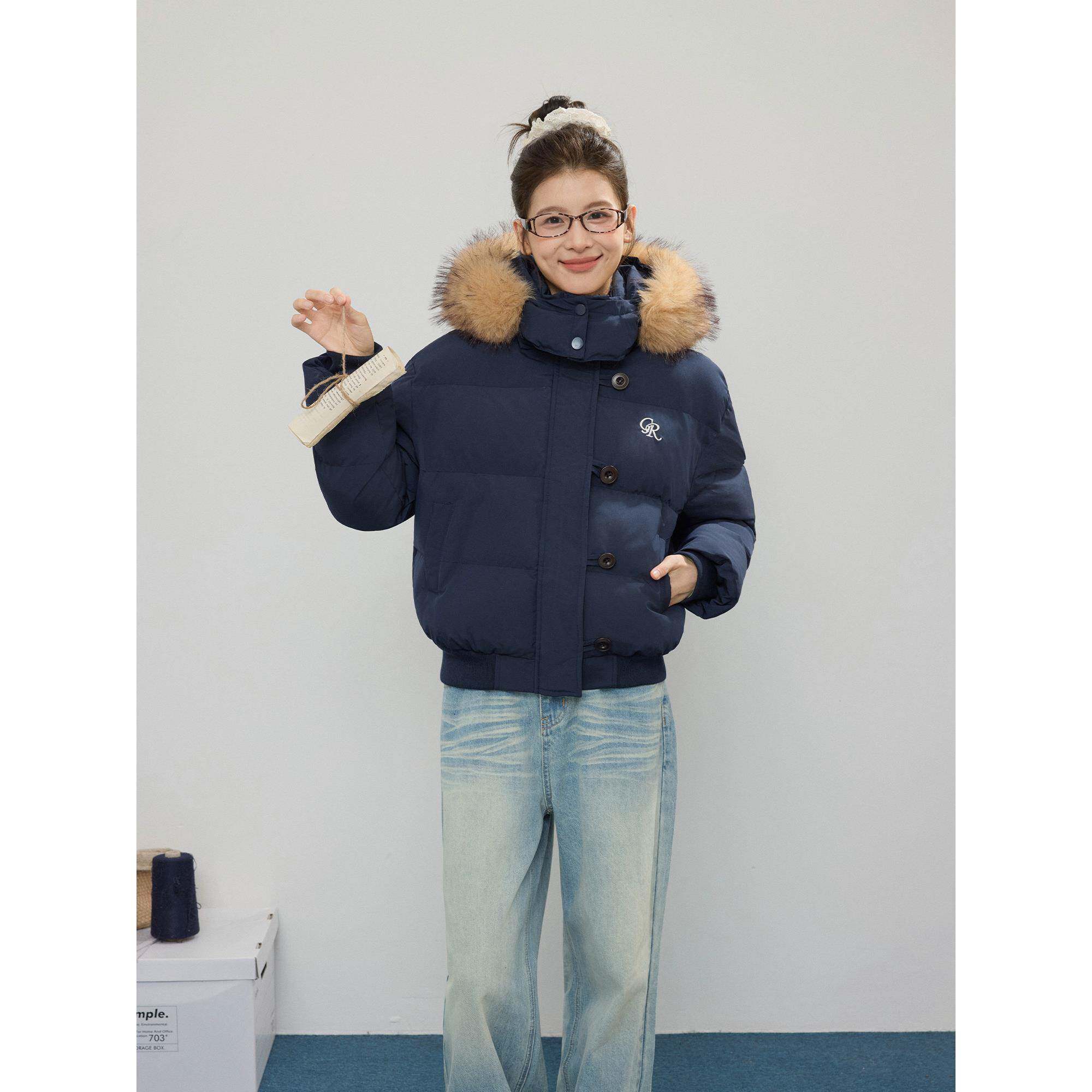 原野空间GRASS SPACE藏青连帽可拆卸毛领棉服女冬保暖棉衣外套潮
