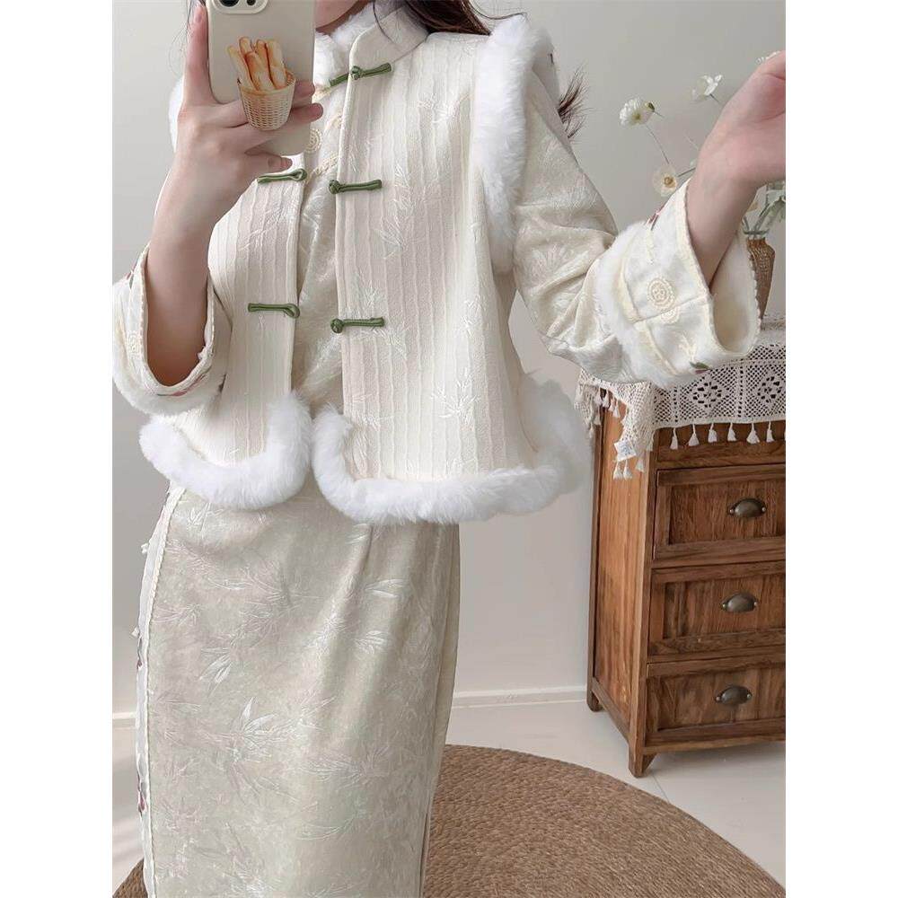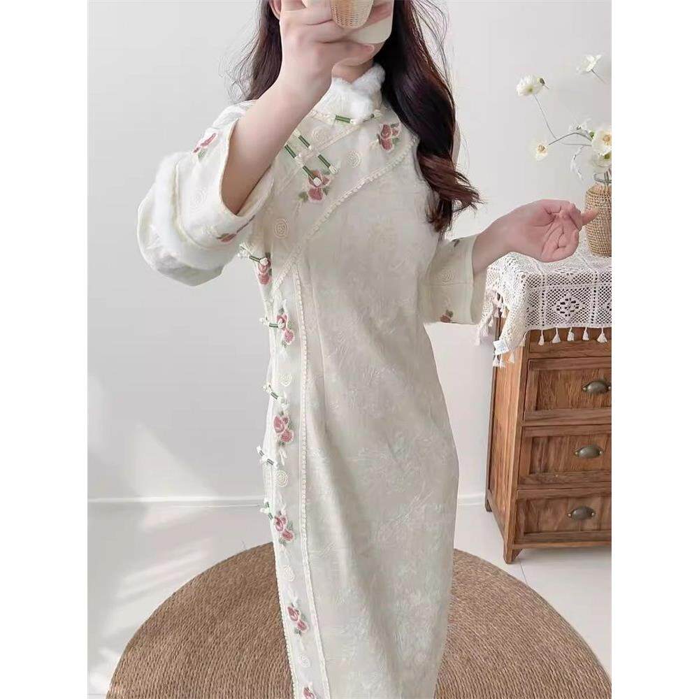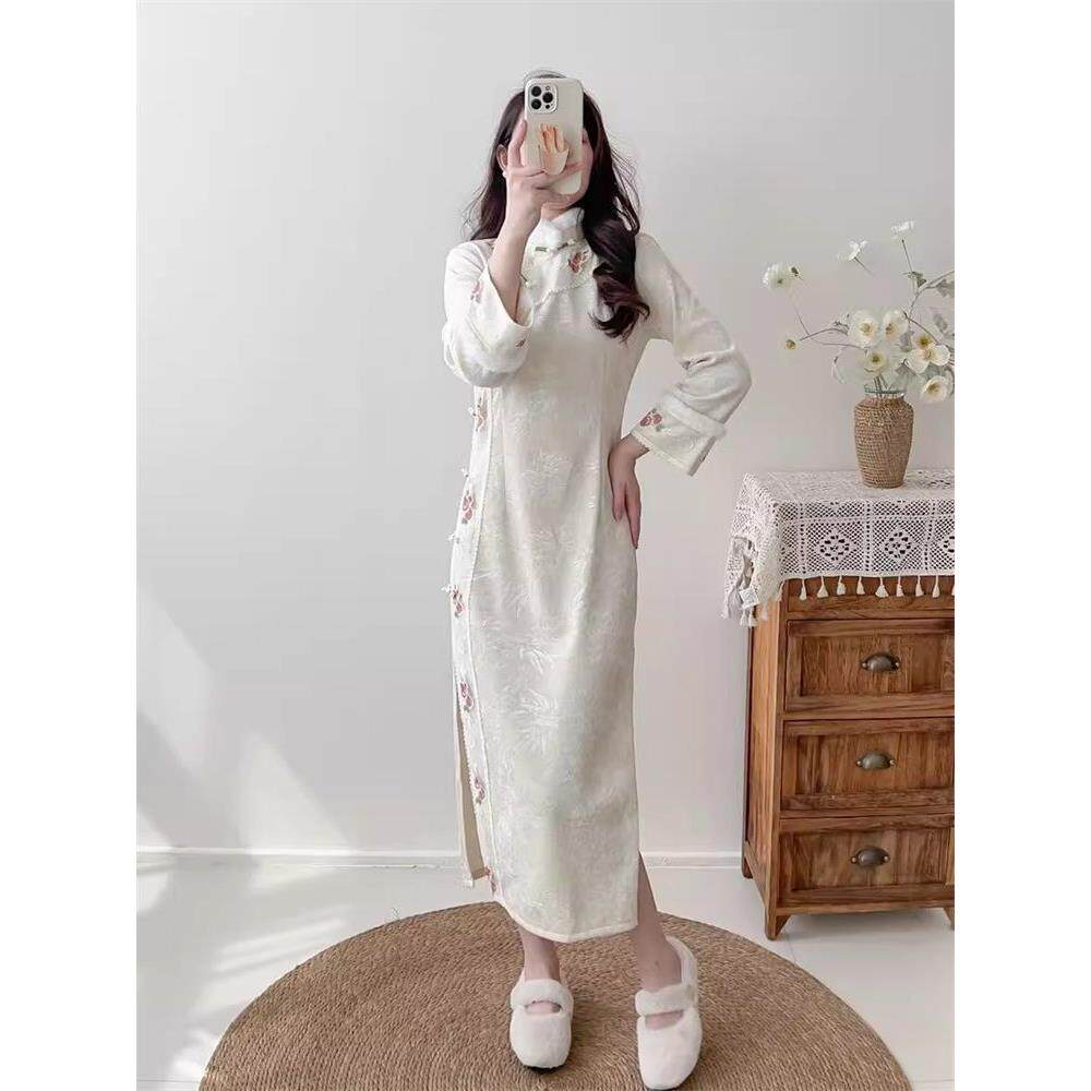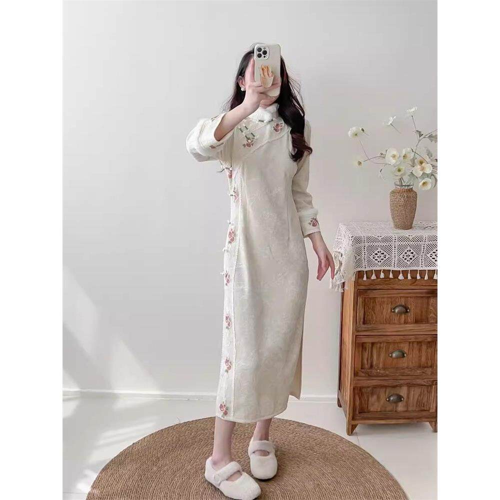 秋冬季新款加绒加厚旗袍日常改良米色绝美气质中长休闲重工连衣裙