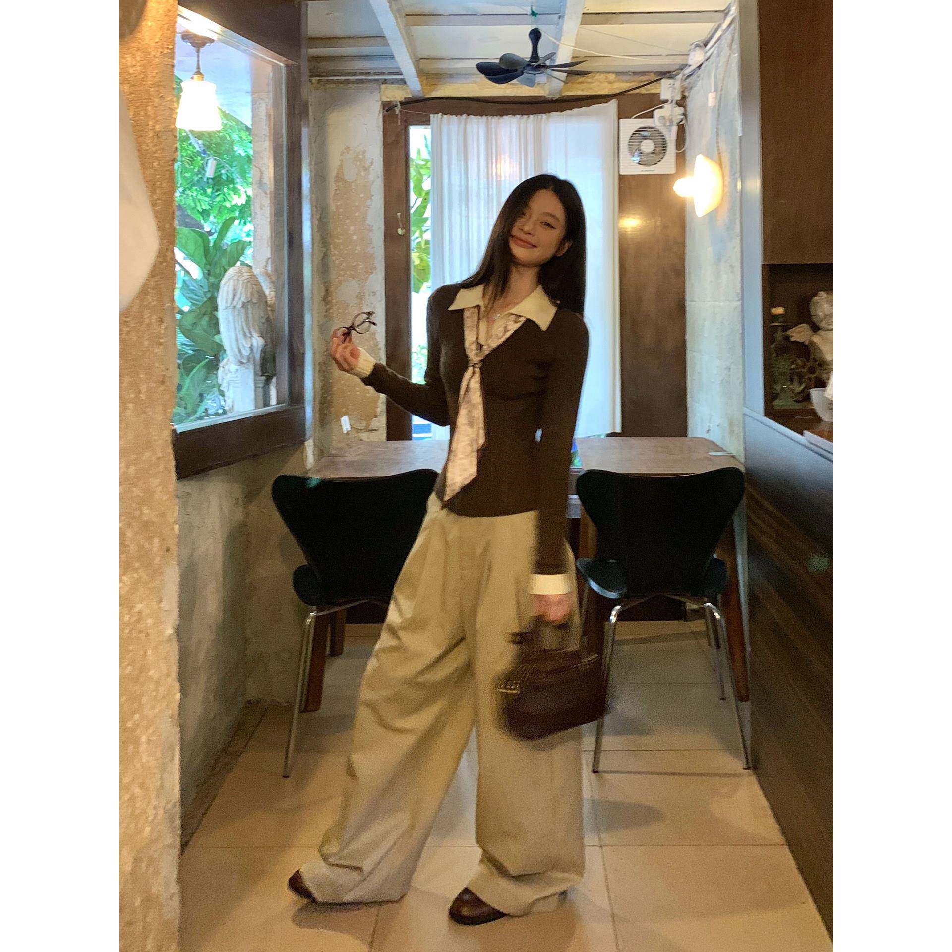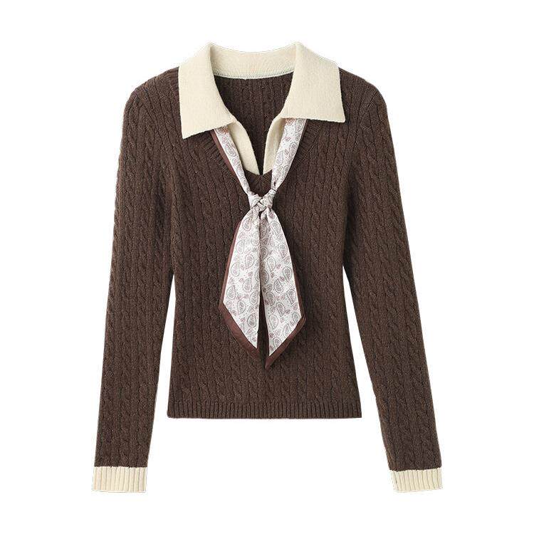 宋正恩咖色Polo领假两件针织衫女秋冬新款毛衣修身短款长袖小上衣