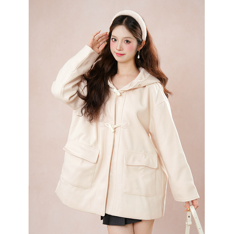 粉色大衣女2025秋冬新款中长款牛角扣毛呢子外套