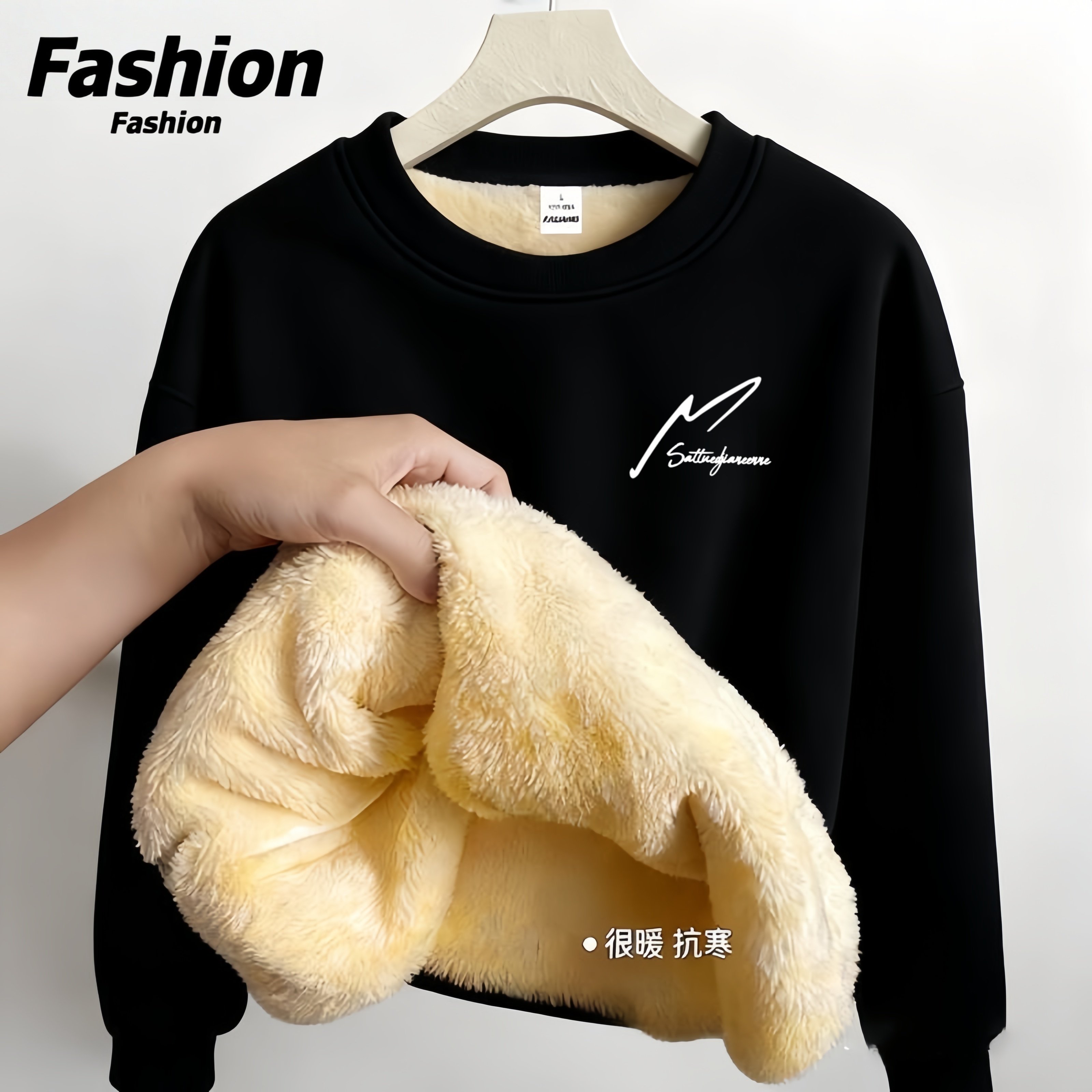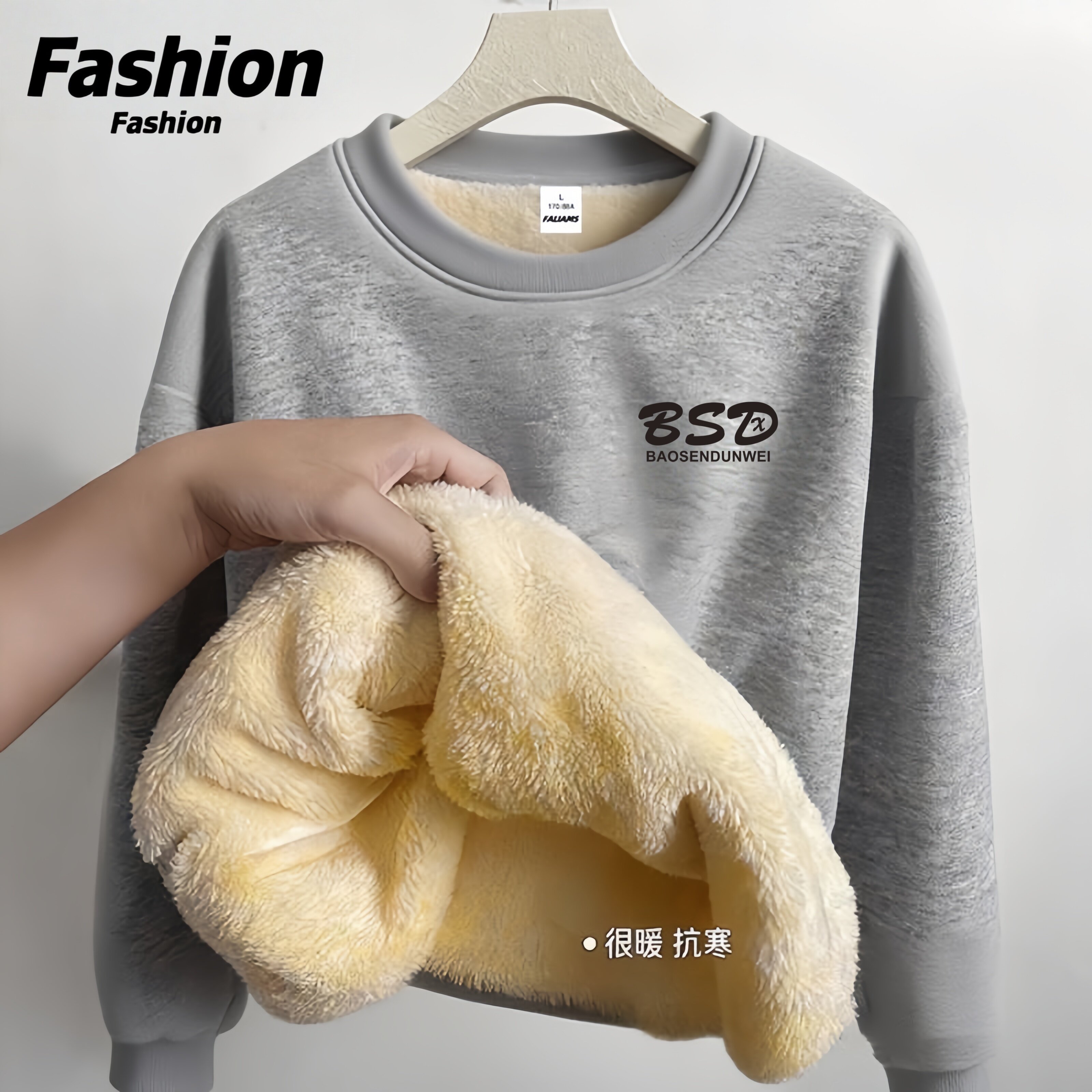 秋冬加绒加厚羊羔绒卫衣男士圆领套头宽松青年重磅保暖外套打底衫