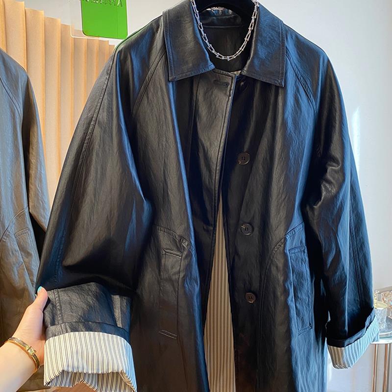 美拉德咖色中长款皮衣外套女2024秋季新款欧货高级感宽松弛感风衣