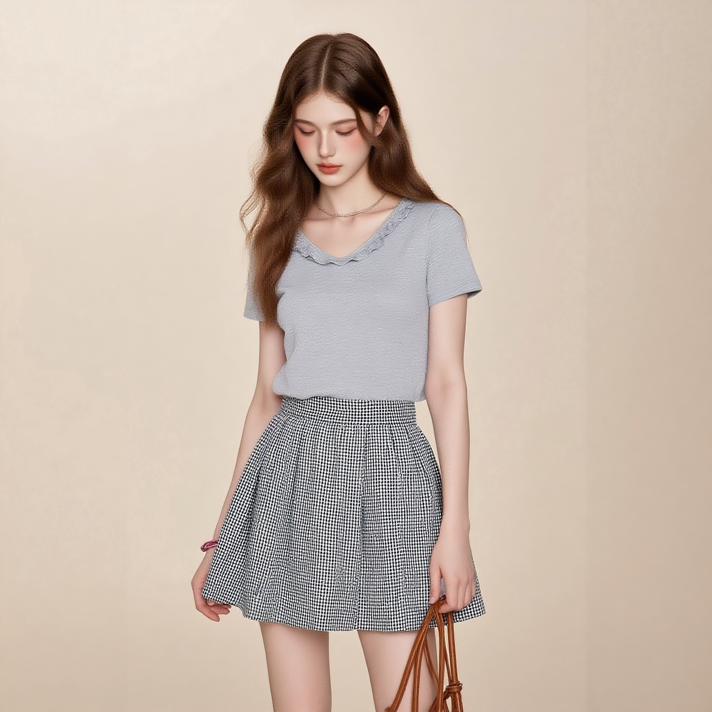 夏季短袖木耳边灰色T恤女修身打底衫上衣