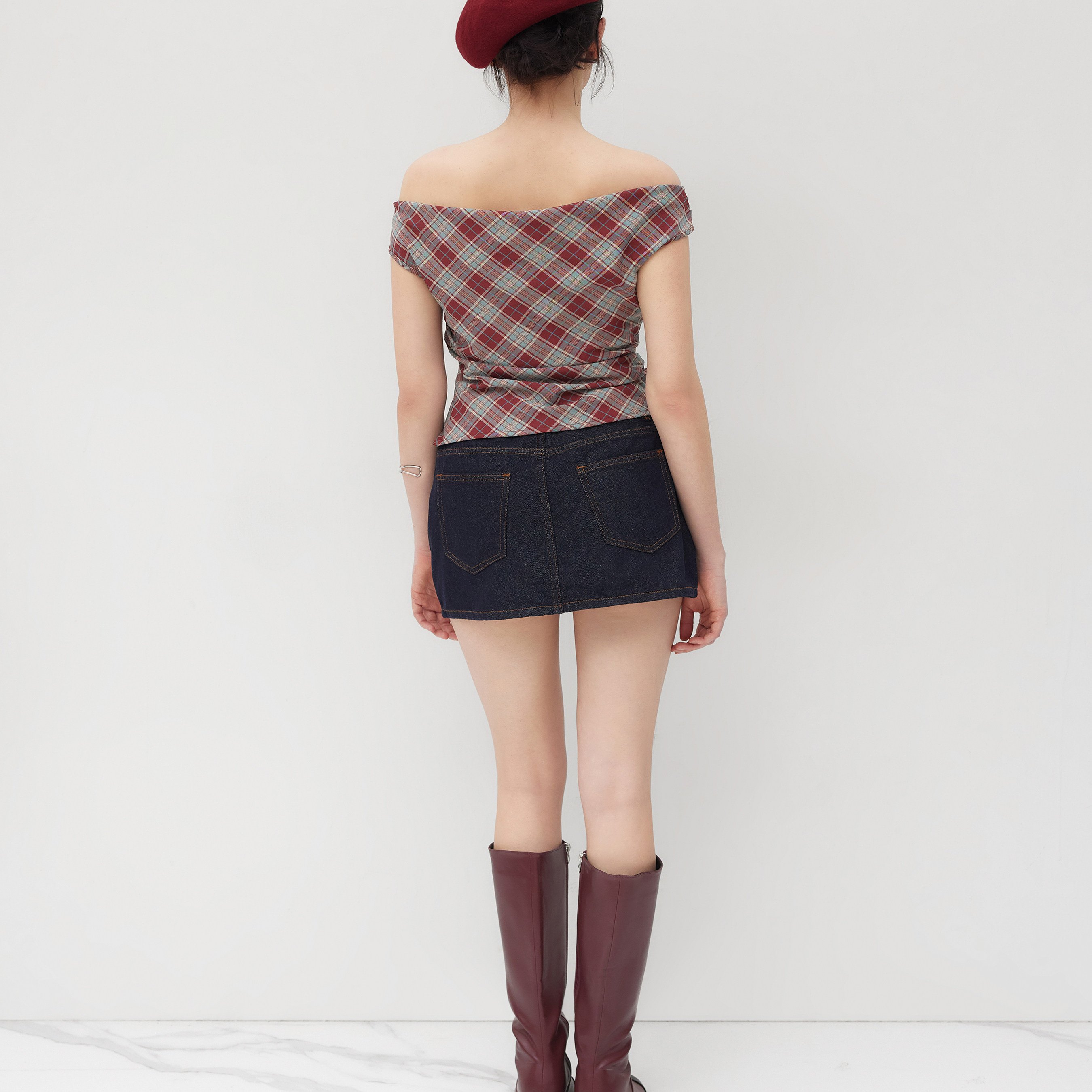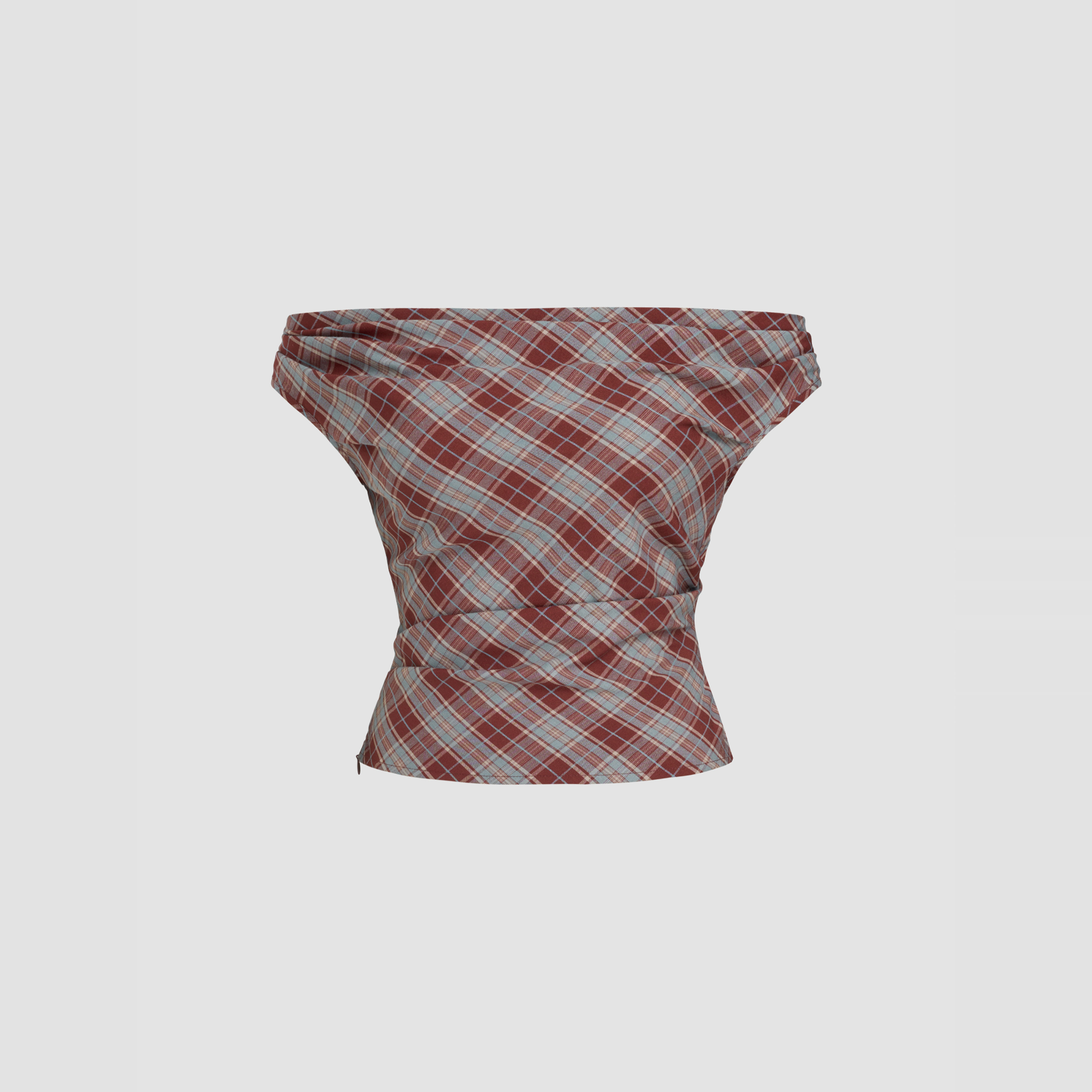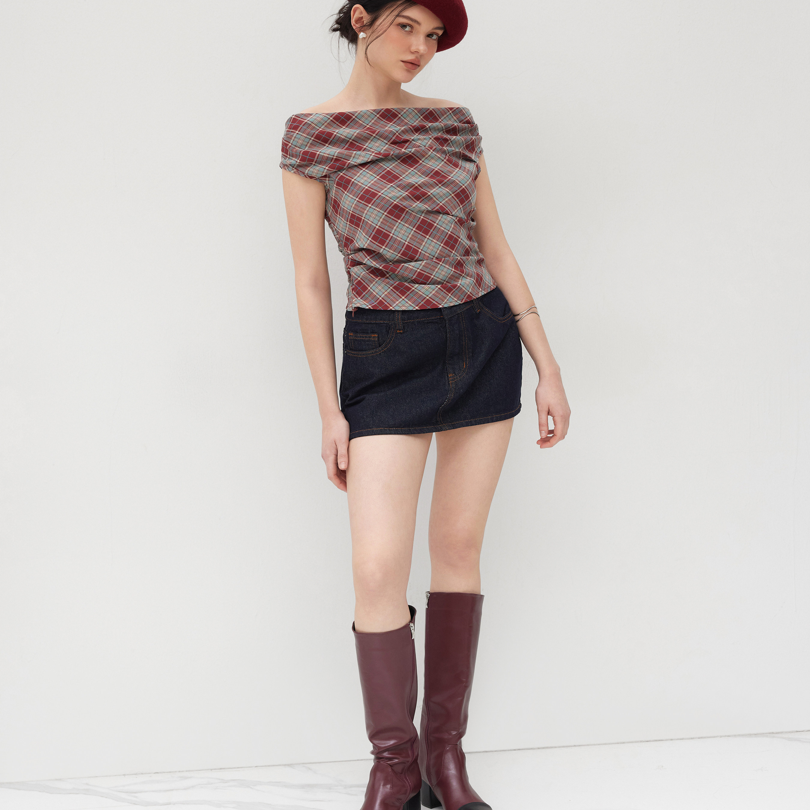 CIDER明星同款正品一字肩美式复古格纹褶皱格子上衣113981213