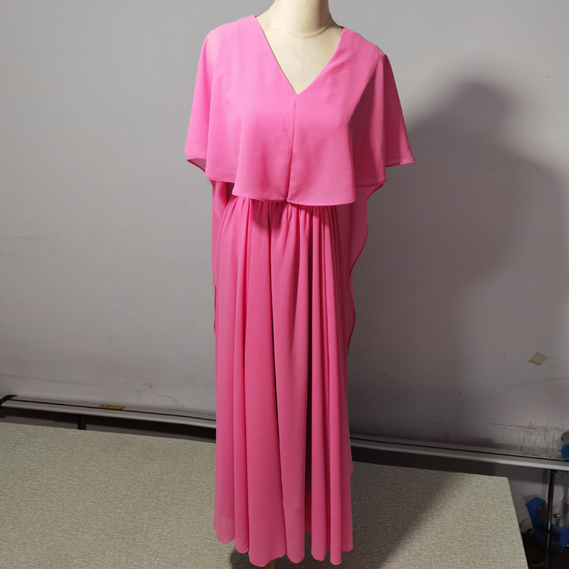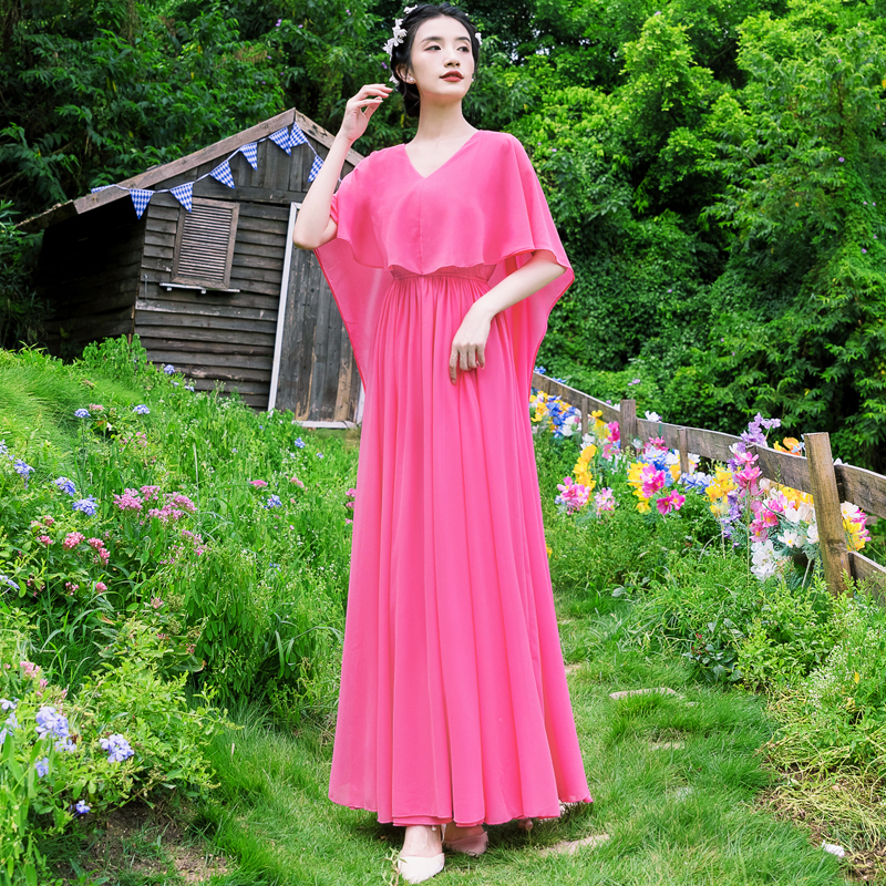 复古V领粉红色雪纺连衣裙女高级感法式别致惊艳大摆披肩拍照长裙