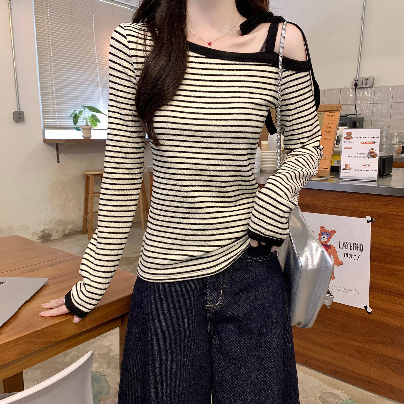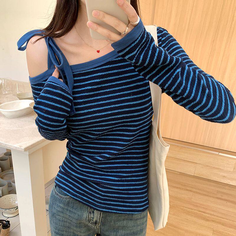 实拍260克条纹长袖t恤女装2025新款露肩设计感修身打底衫斜领上衣
