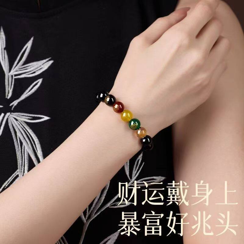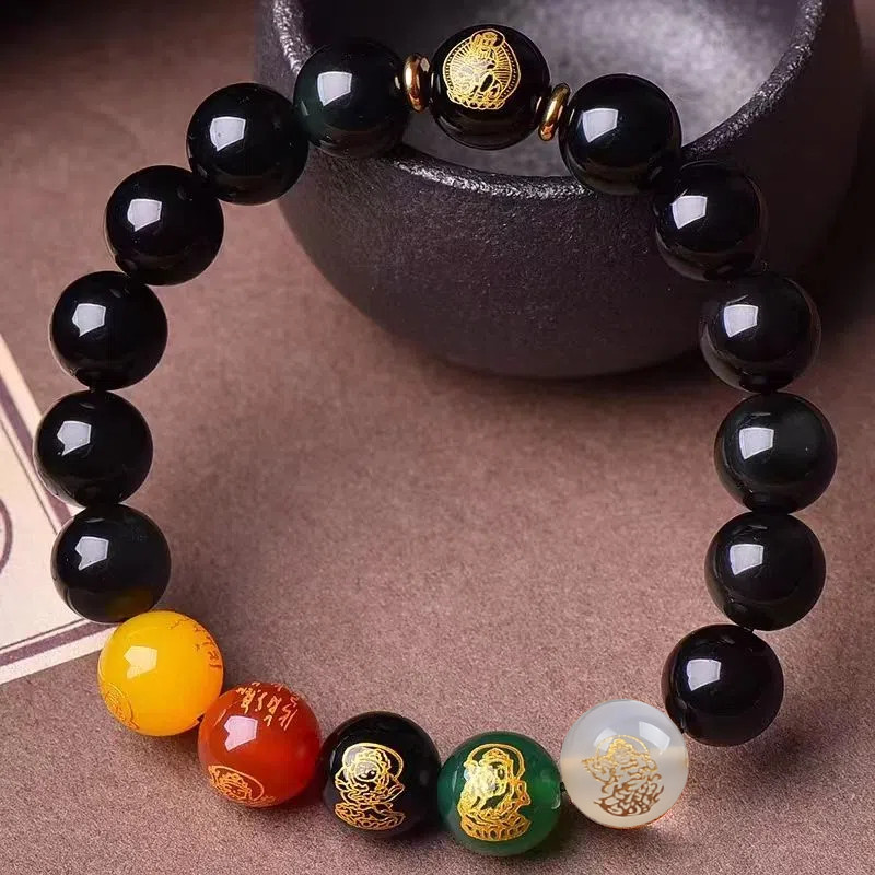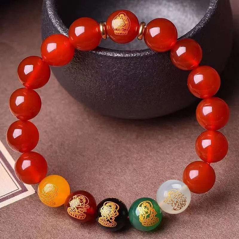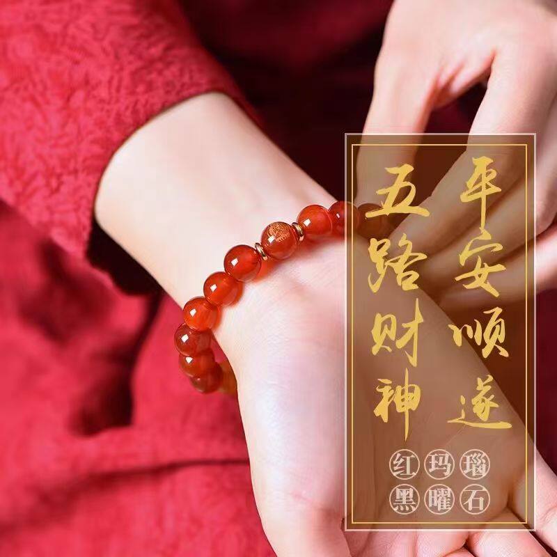 五路财神黑曜石红玛瑙手链 生肖守护神手串 本命佛转运珠男女