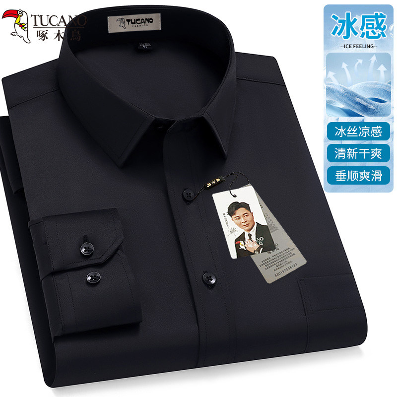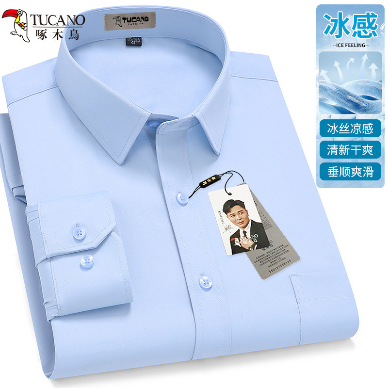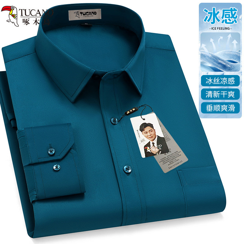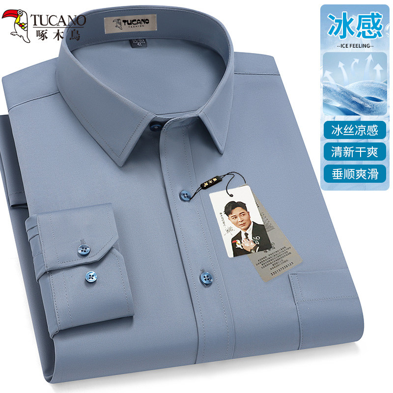 啄木鸟冰丝夏季薄款长袖衬衫男士大码免烫抗皱中年纯色衬衣爸爸装