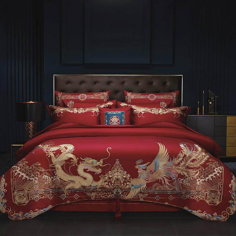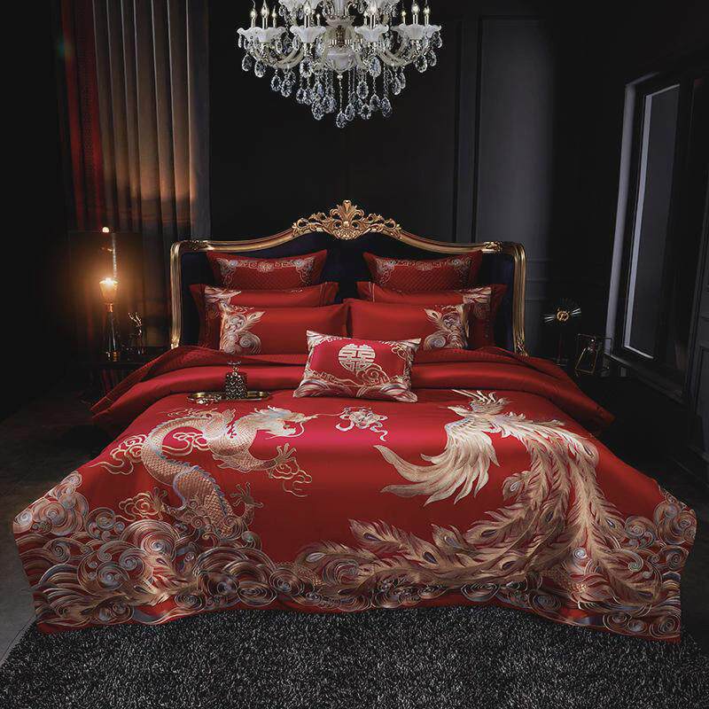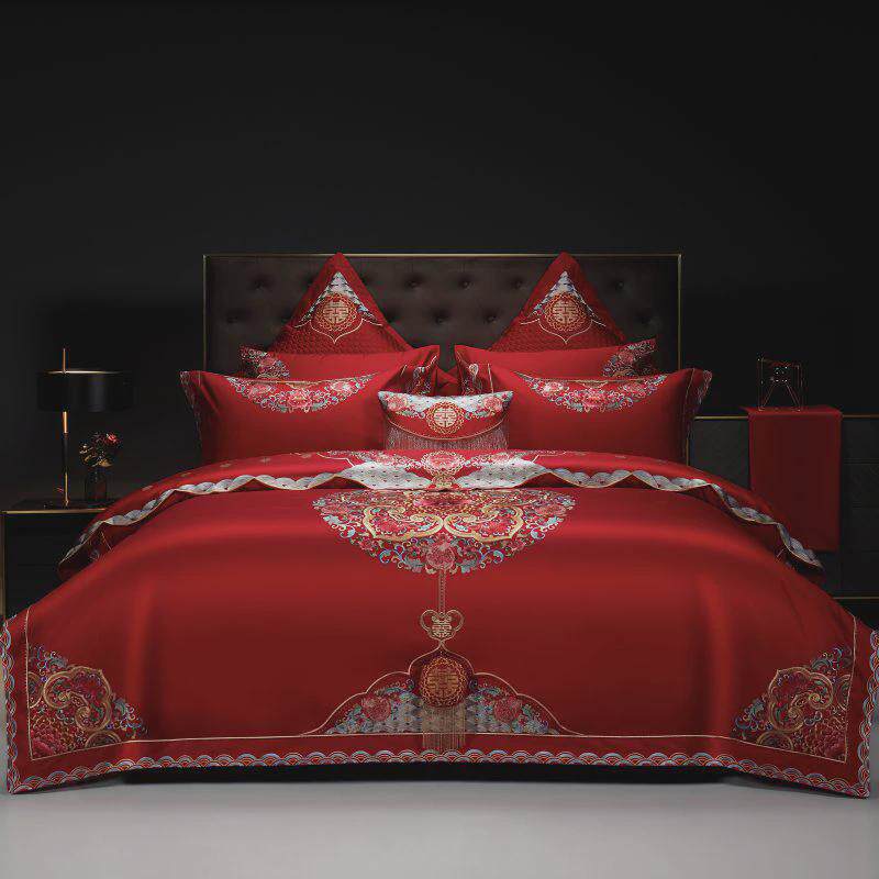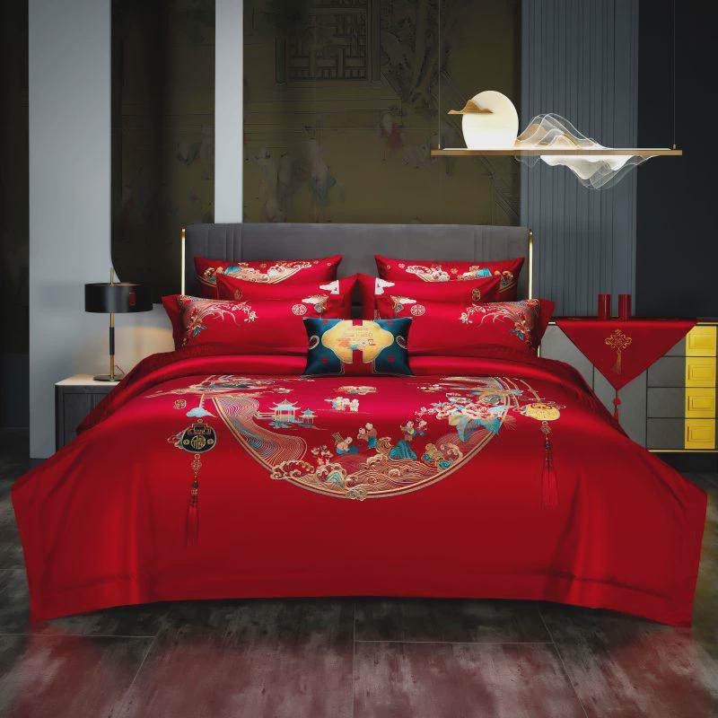 高定婚庆160结婚贡缎长绒棉刺绣四件套全棉支红色婚嫁床品多件套