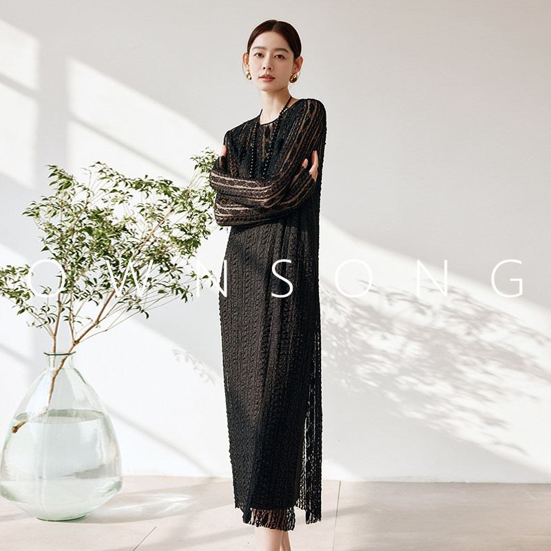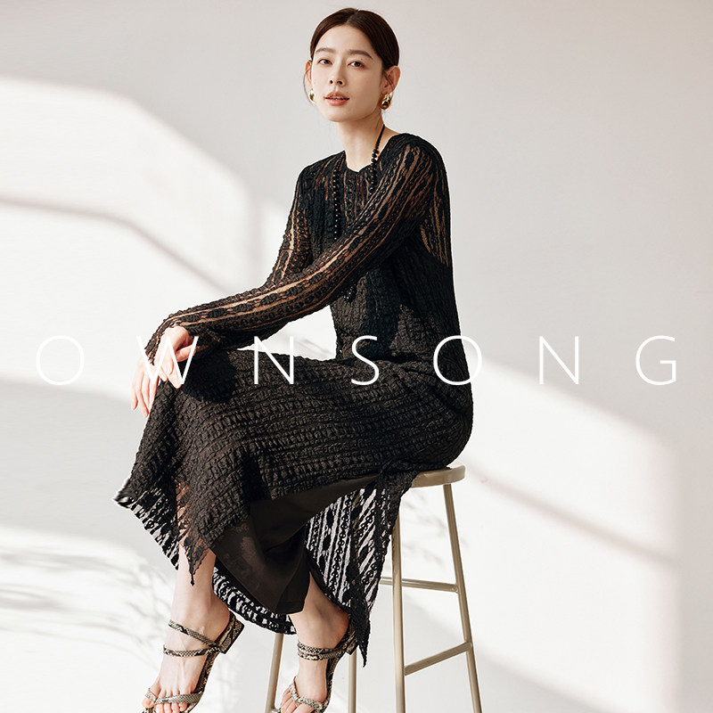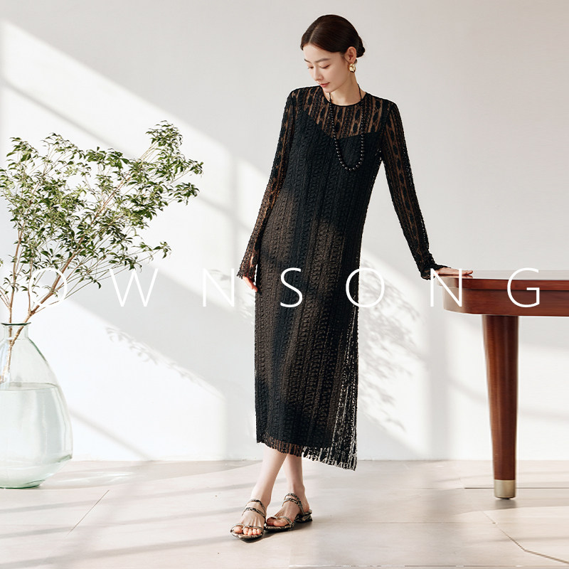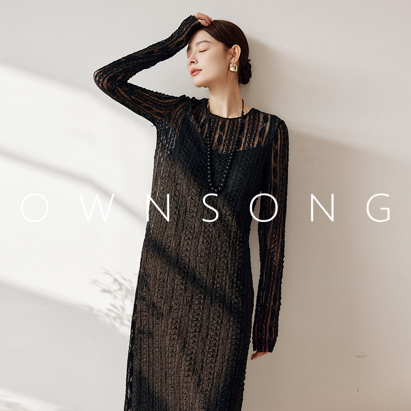 OWNSONG文艺复古小众钩织蕾丝镂空针织连衣裙圆领宽松侧开叉长裙
