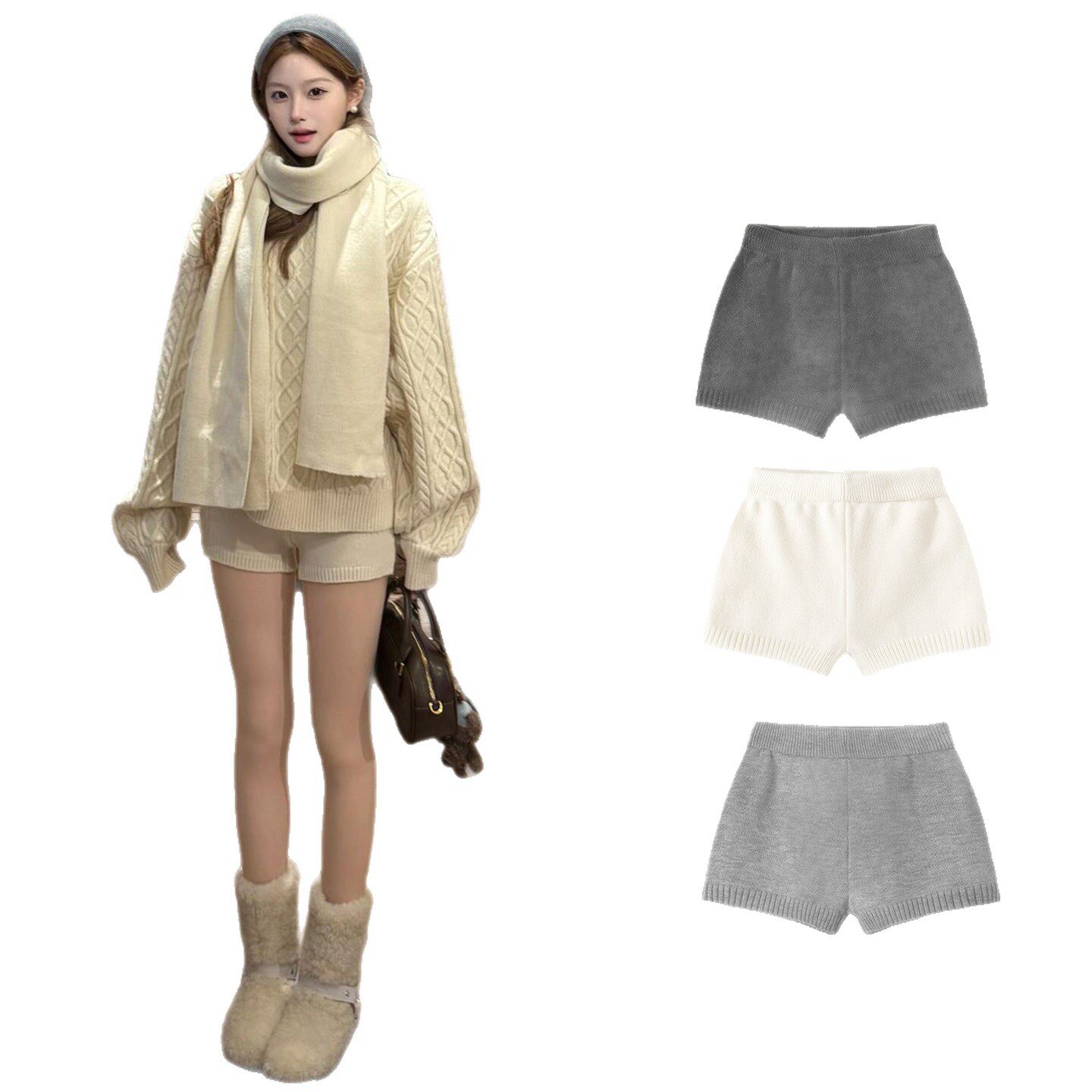 奶白色针织短裤女秋冬季2025新款宽松显瘦小个子加绒毛线外穿热裤