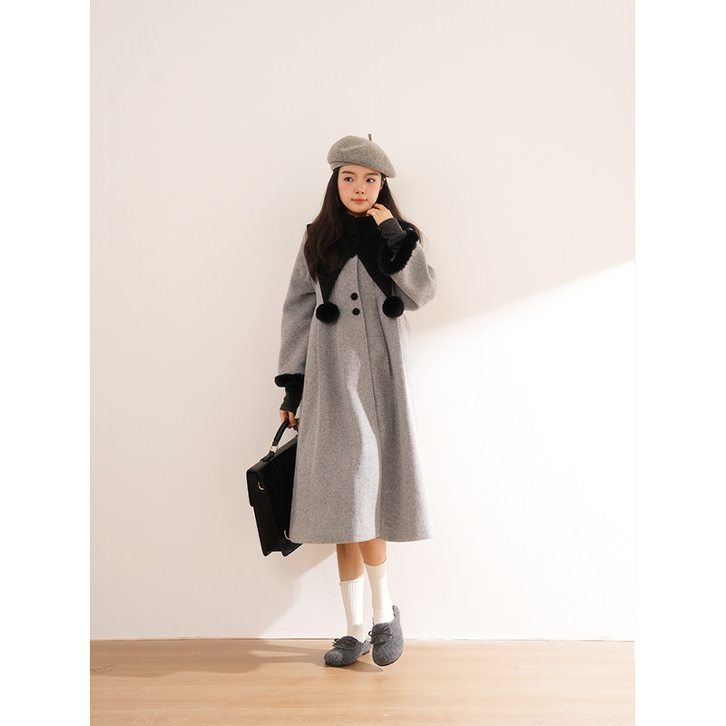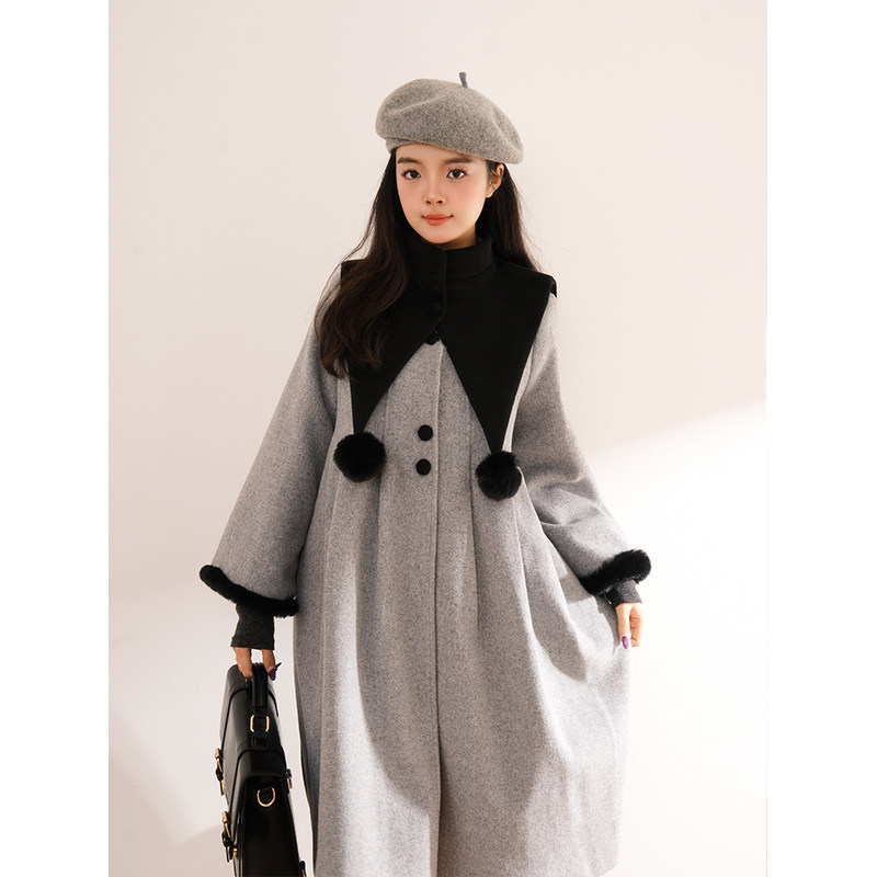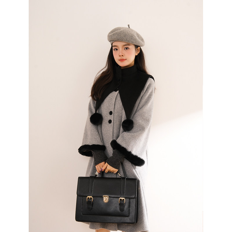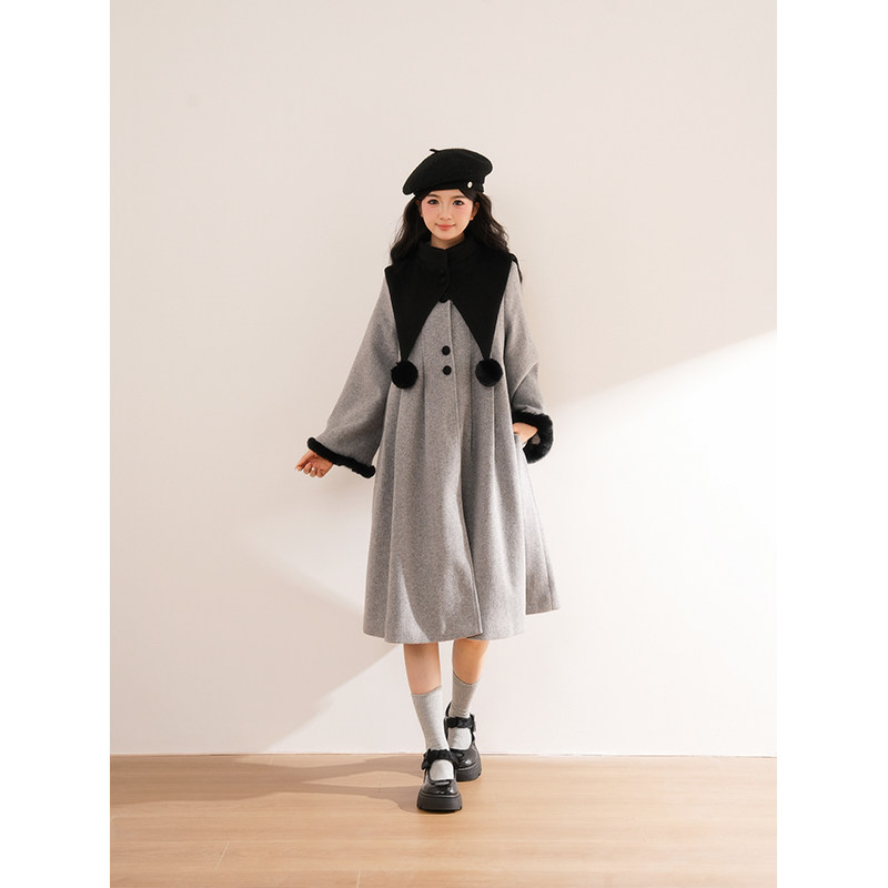 【冬日小魔女】日系可爱蝴蝶结毛球披肩+纽扣裙大衣中长外套两件