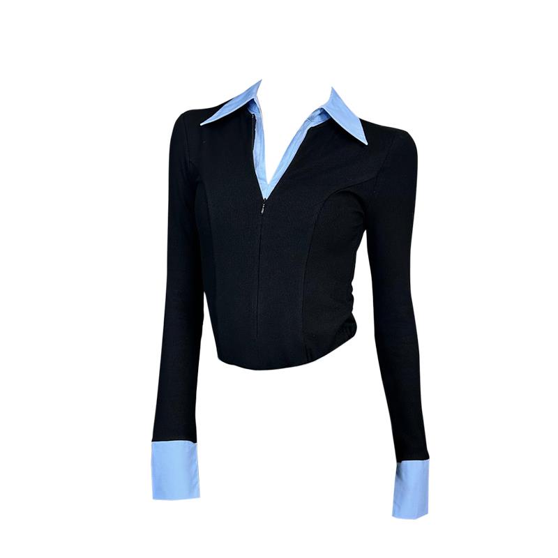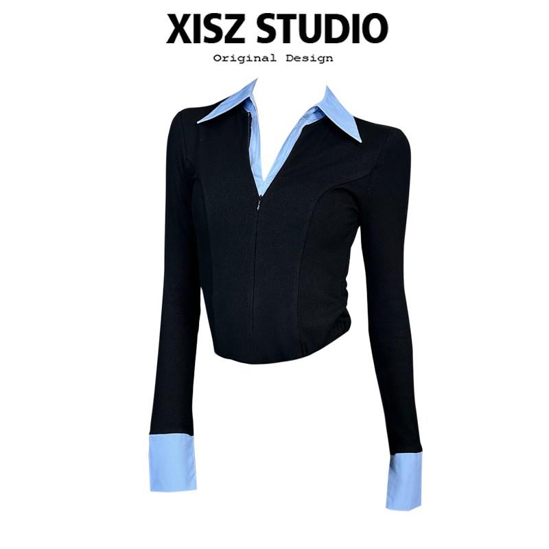辣妹高级感撞色假两件POLO领上衣女早春季小众修身显瘦内搭打底衫