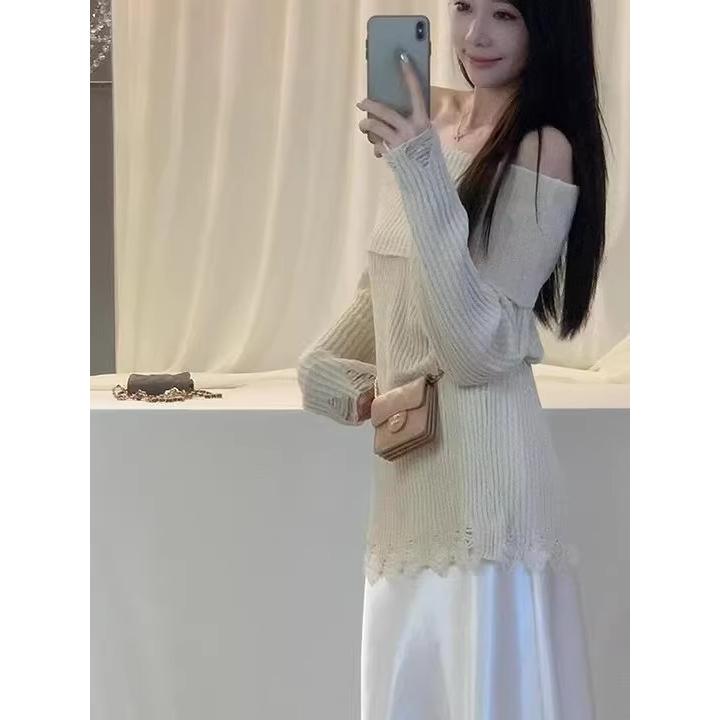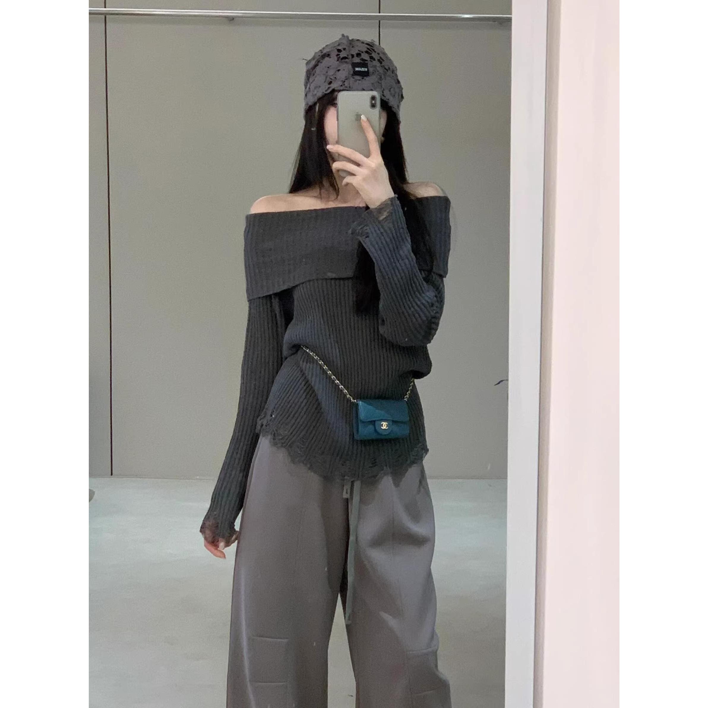 灰色一字肩针织衫女2025秋季新款纯欲风辣妹毛衣今年流行漂亮上衣