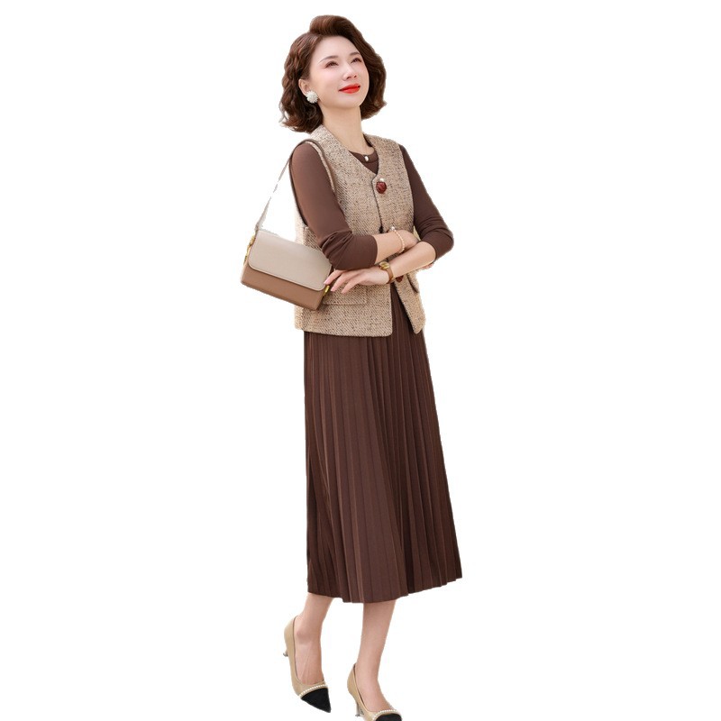 妈妈春装连衣裙套装洋气马甲两件套中老年女装百搭打底裙