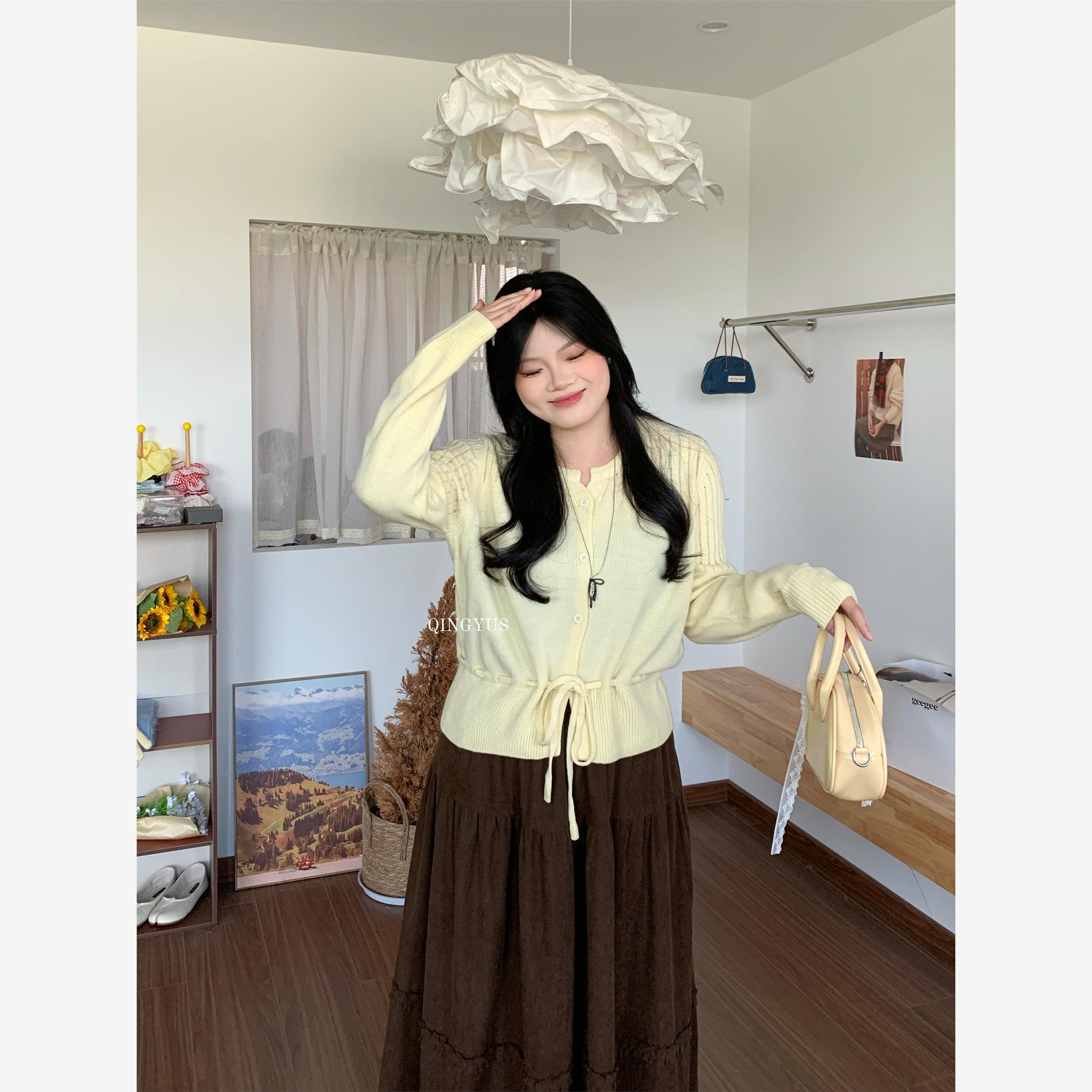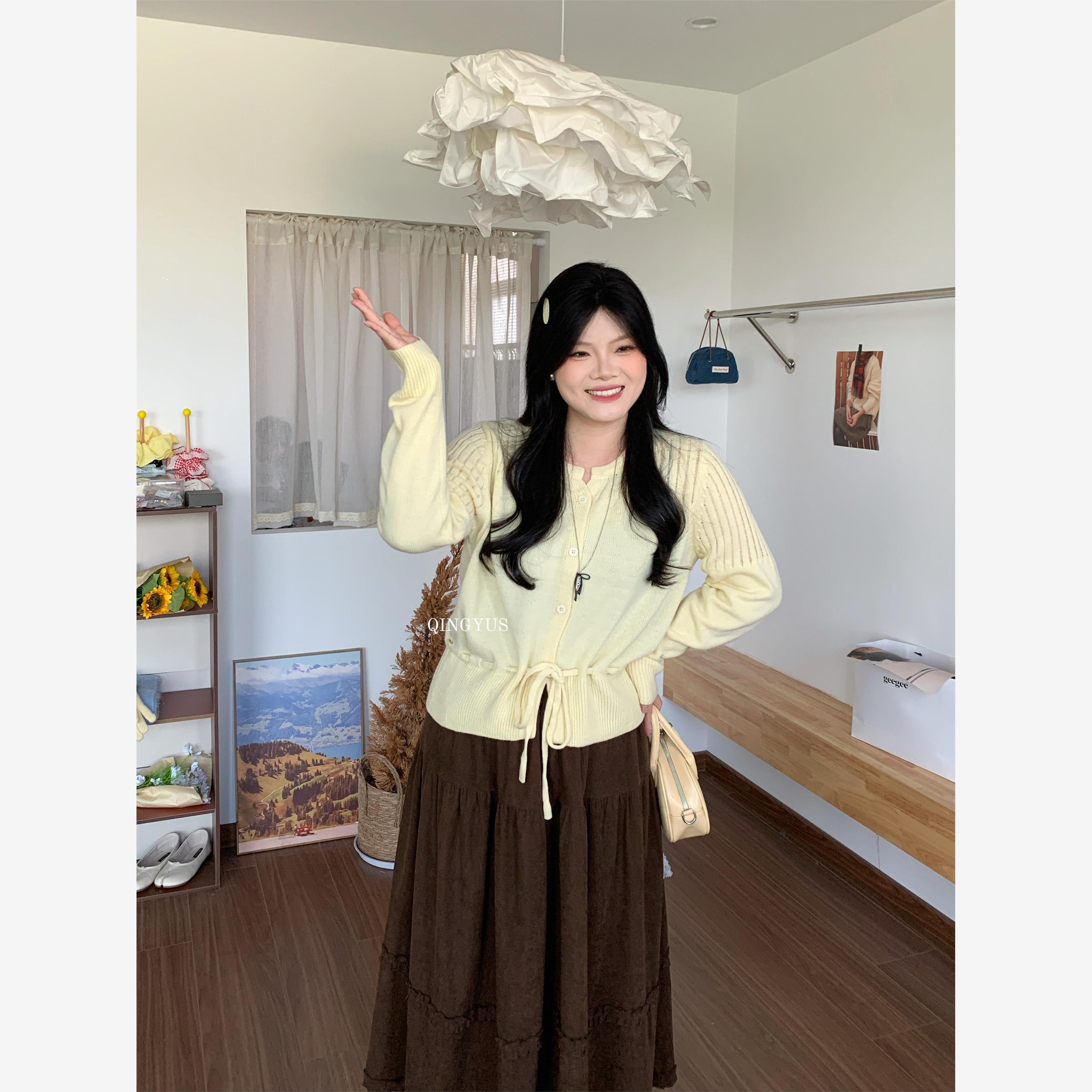 青屿衫-微胖显瘦韩系温柔风气质系带针织开衫女百搭上衣秋季大码