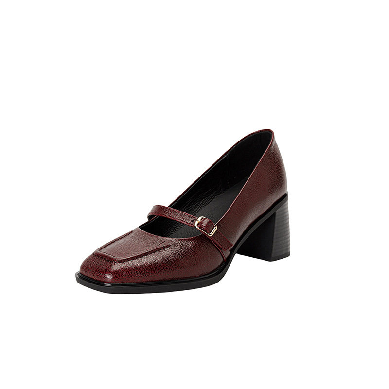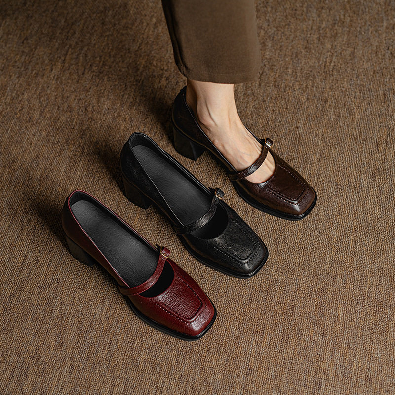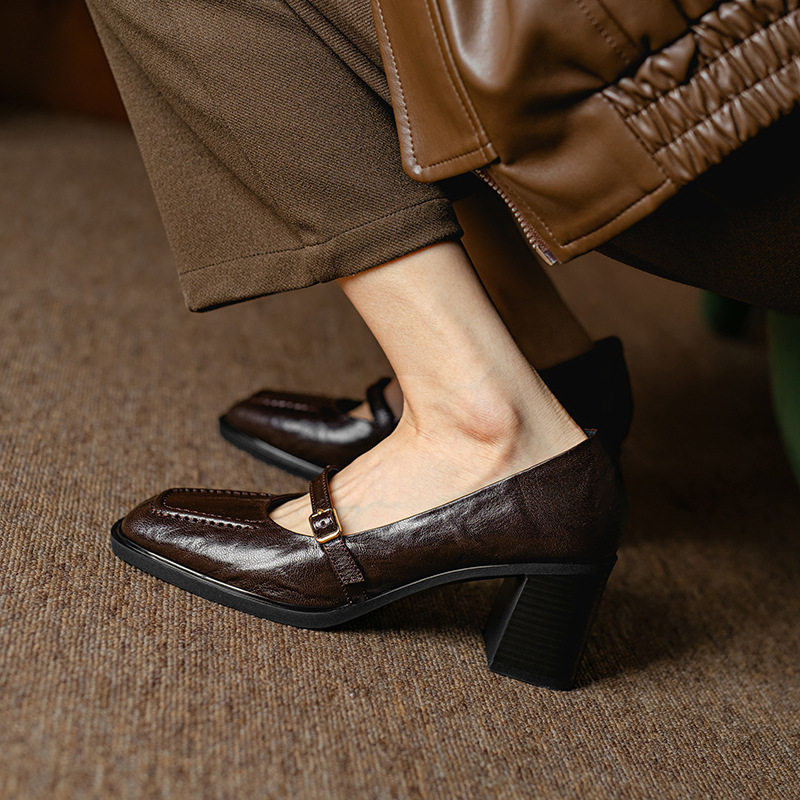 法式优雅气质粗跟浅口一字带玛丽珍单鞋2024秋里外全皮复古高跟鞋