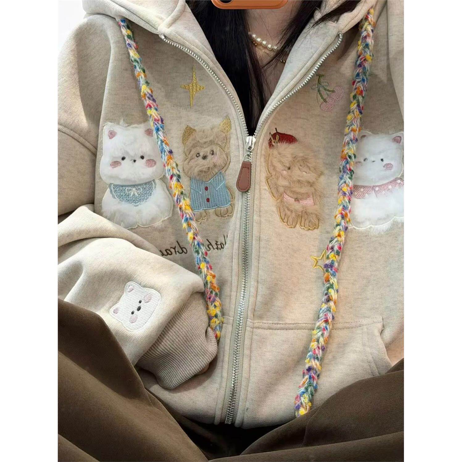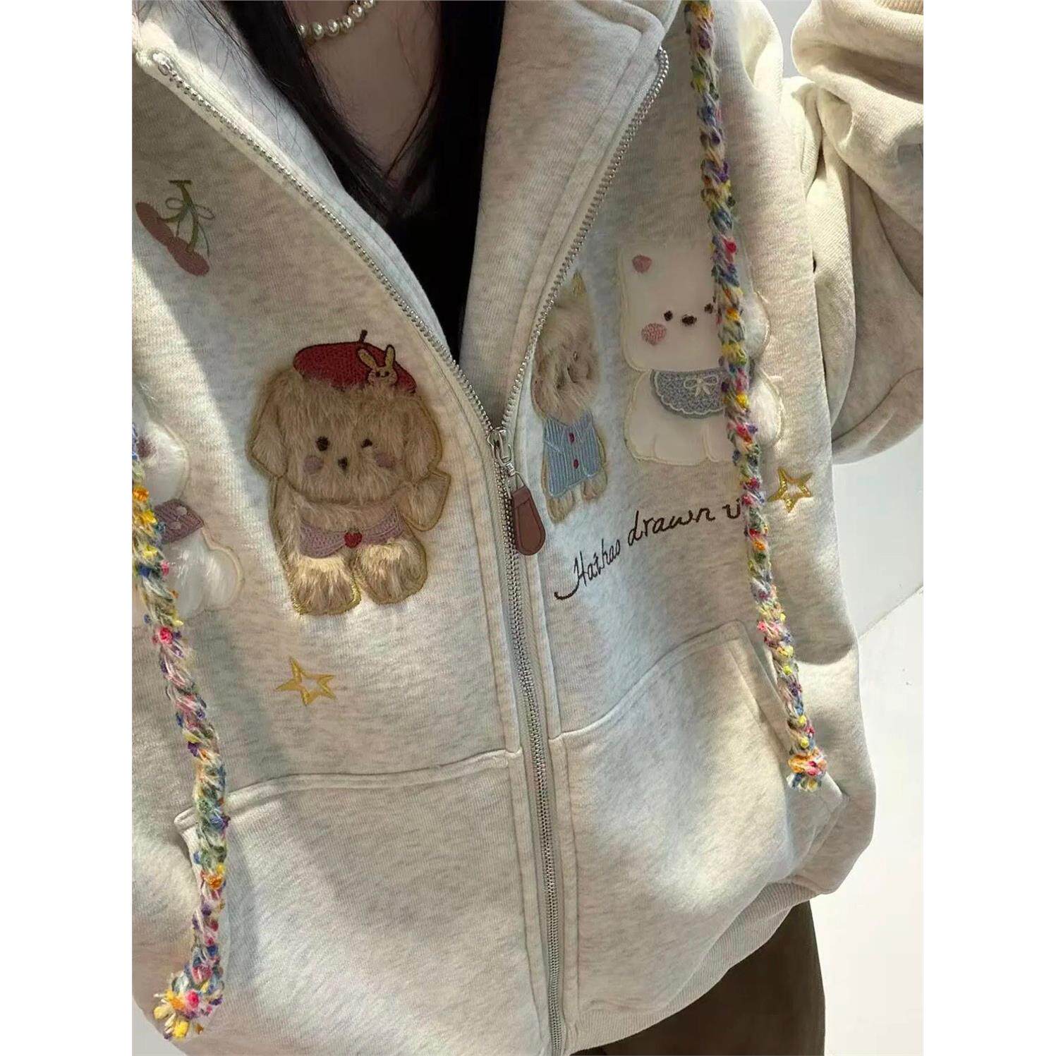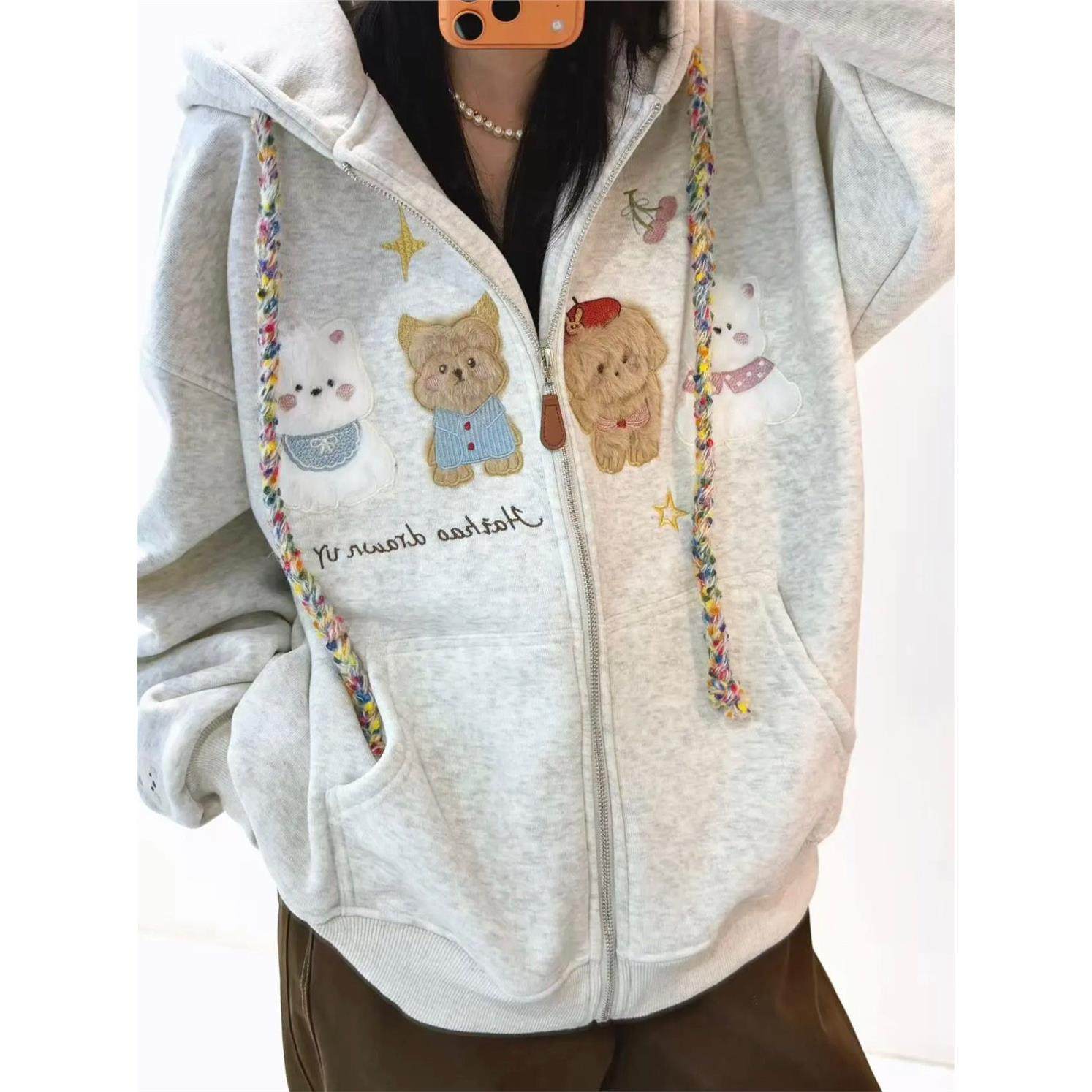 加绒重磅卡通刺绣小狗卫衣女秋冬季拉炼宽松休闲加厚连帽开衫外套