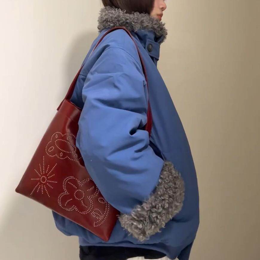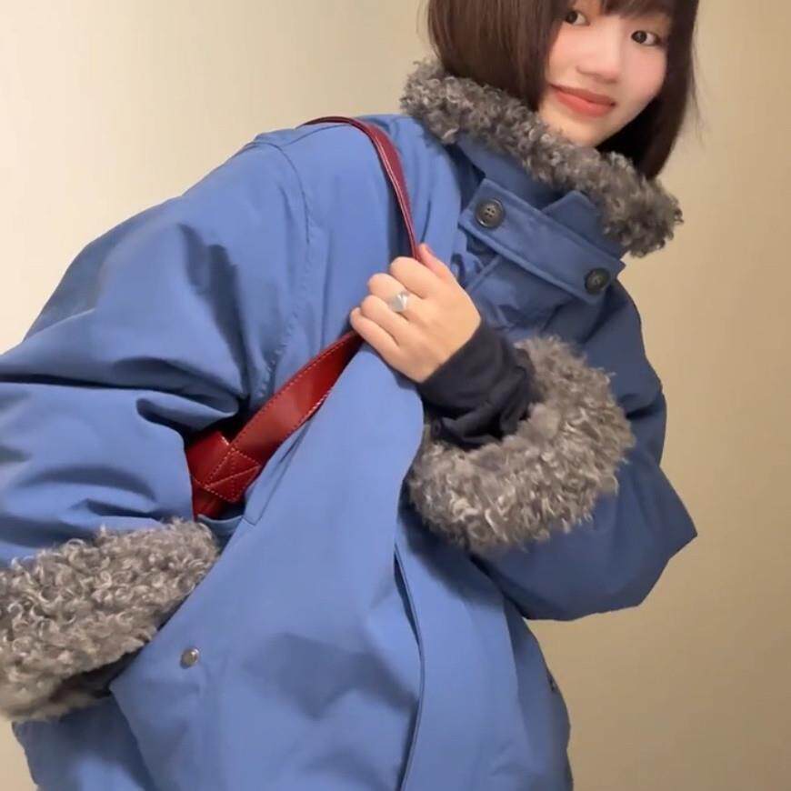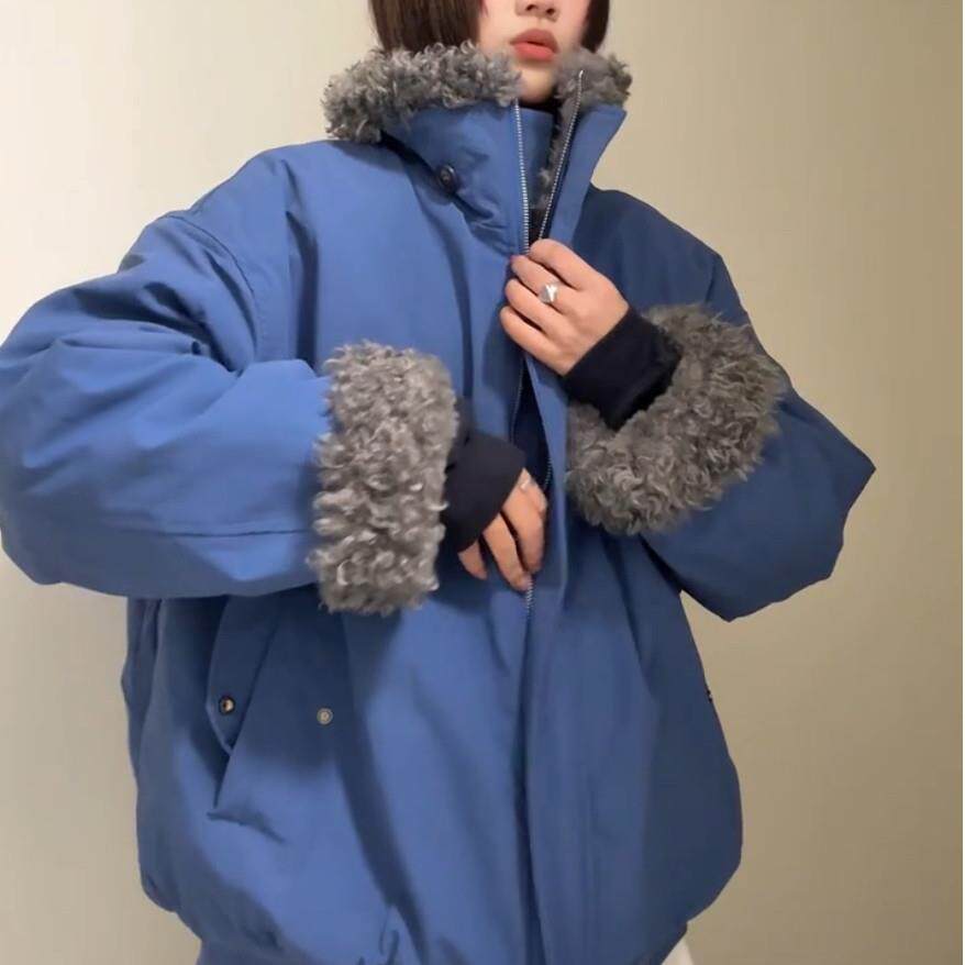 美式复古蓝色毛毛拼接夹克外套女秋冬季设计感加厚保暖棉服派克服