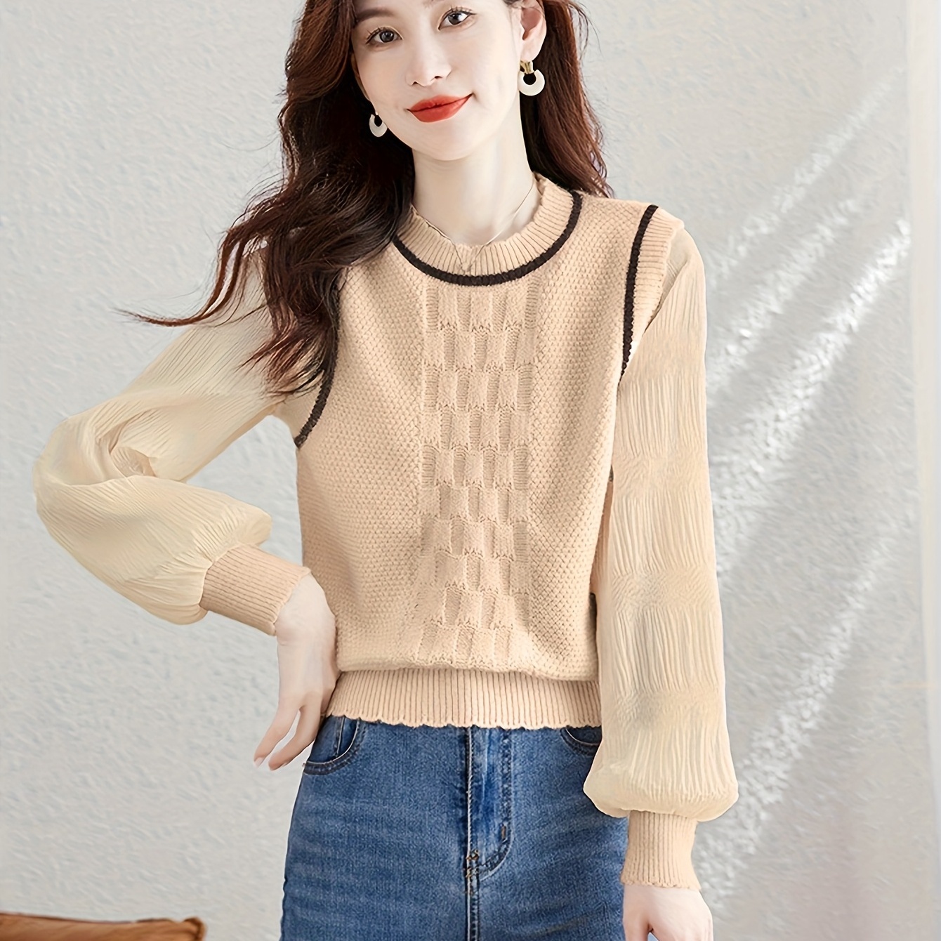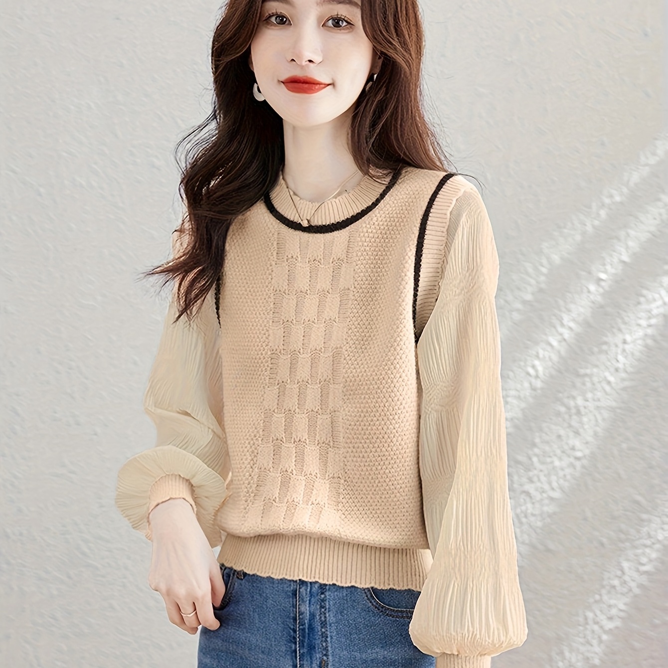 2025早秋新款假两件圆领针织衫女韩系甜美减龄时尚百搭毛衣上衣