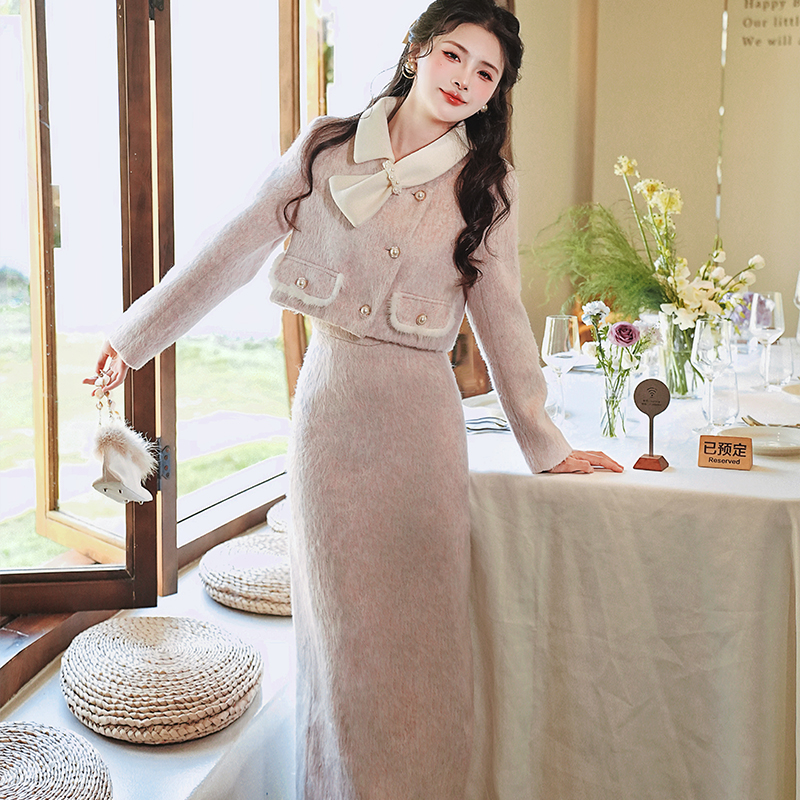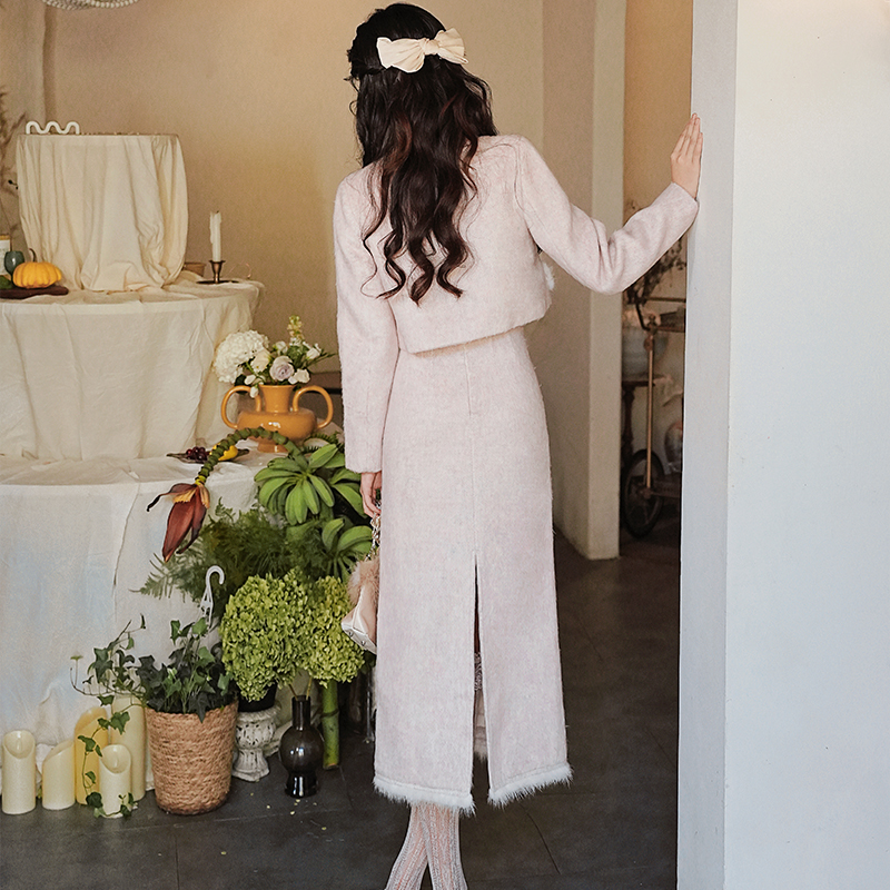 富家千金法式粉色加厚短外套半身裙两件套 上架+40
